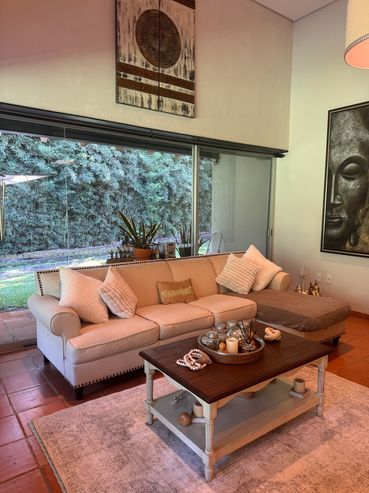 Ampla sala de estar com cozinha aberta, toda com janelas grandes com vista para o jardim.