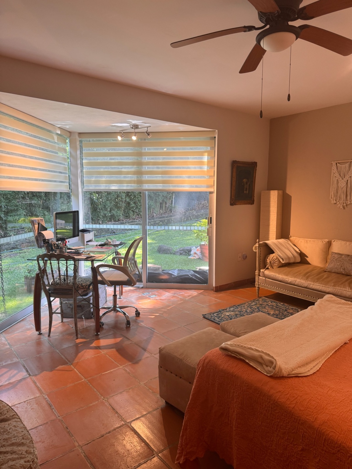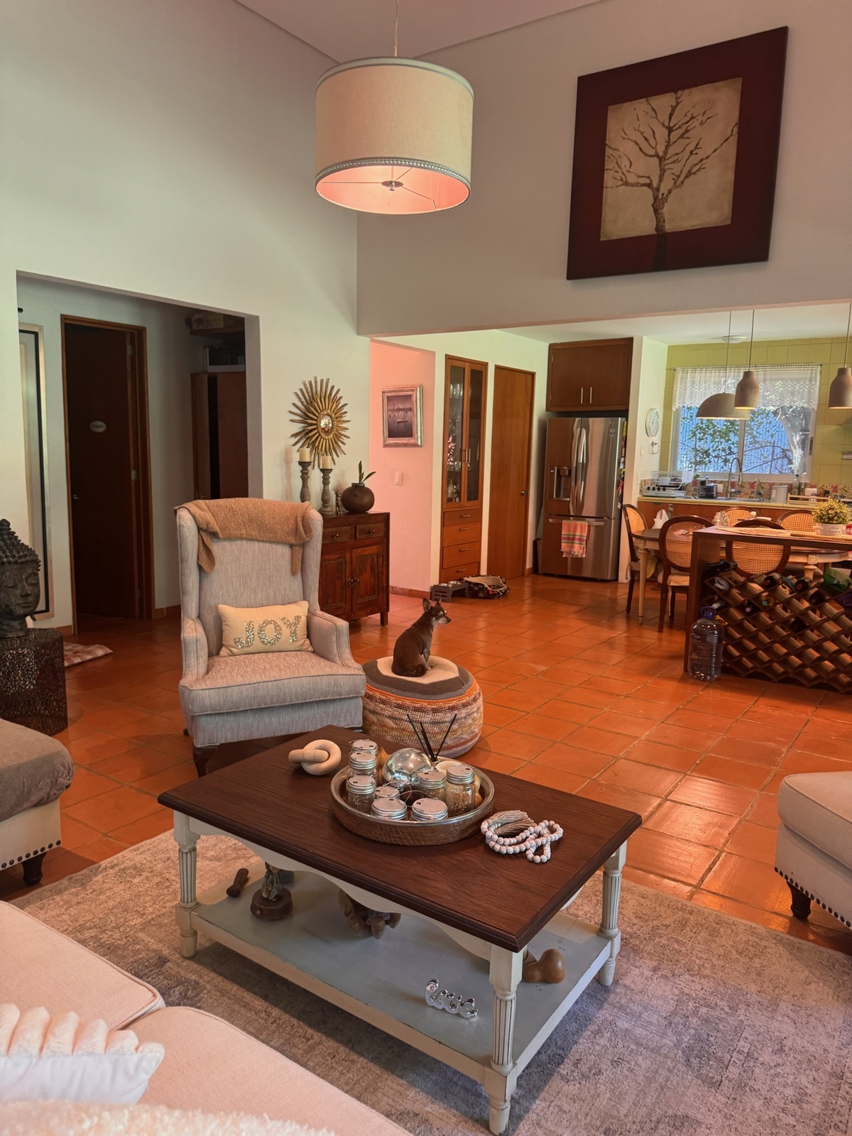 Amplia estancia con cocina abierta, toda con ventanales con vista al jardín.