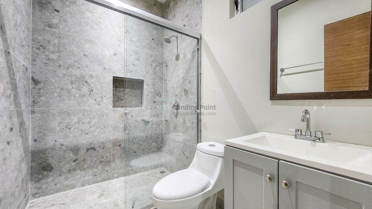 - Baño completo: Equipado con cancel de cristal, mueble, espejo y accesorios.