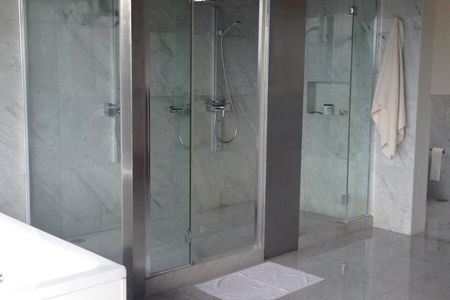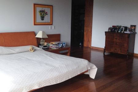 O quarto principal com sala, terraço, banheiro/chuveiro duplo e closets.