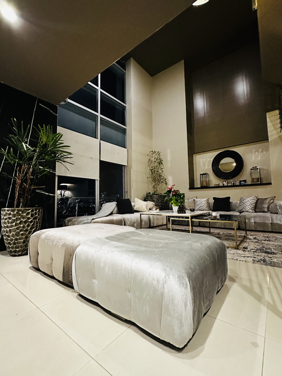 Com sua altura dupla, orientação Norte-Sul que mantém o apartamento fresco, amplitude, sofisticação, luxo e elegância, com móveis de primeira, decoração e tudo o que é necessário para viver.