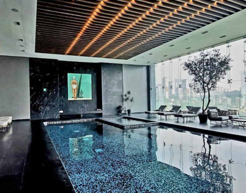 Alberca techada con vista al campo de golf.