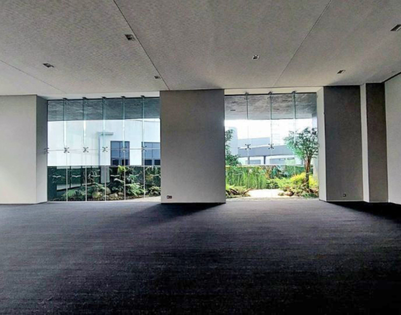 Salão de festas com grande terraço e cozinha industrial.