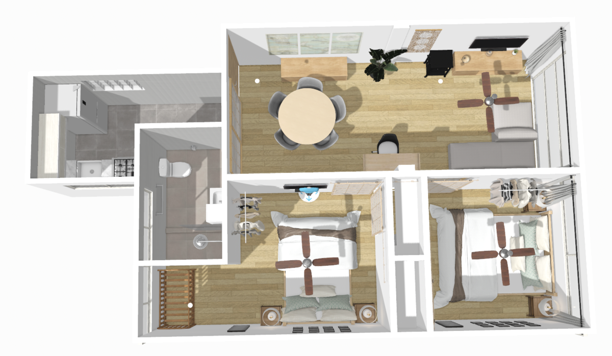 Incluye: camas, televisores, sala, comedor, refrigerador, estufa, microondas, lavadora y secadora.