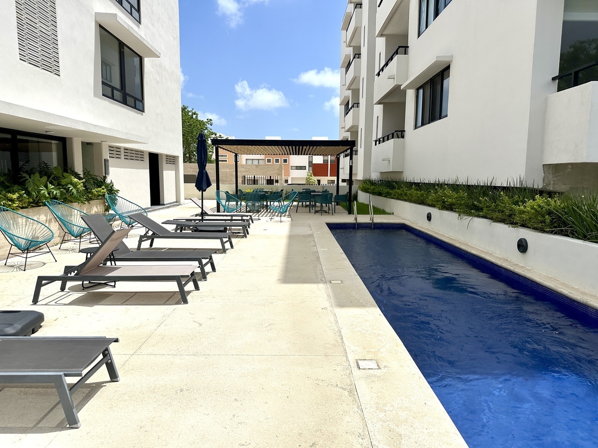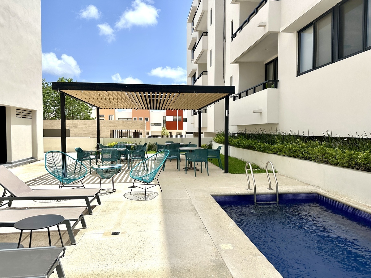Amenidades: Lobby con caseta de seguridad, Alberca y asoleadero, Gimnasio, Áreas verdes.