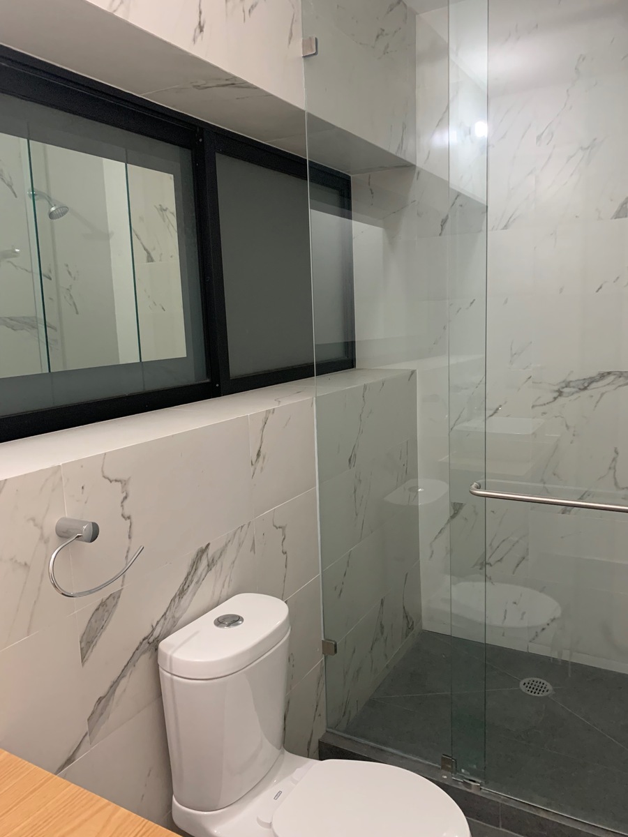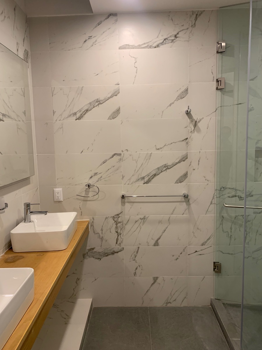 Lago esmeralda pronto para ocupação: 3 quartos, todos com banheiro, o principal com closet e dois com armários, pisos de porcelanato tipo madeira em tom cinza, armários de carvalho na cor natural.
