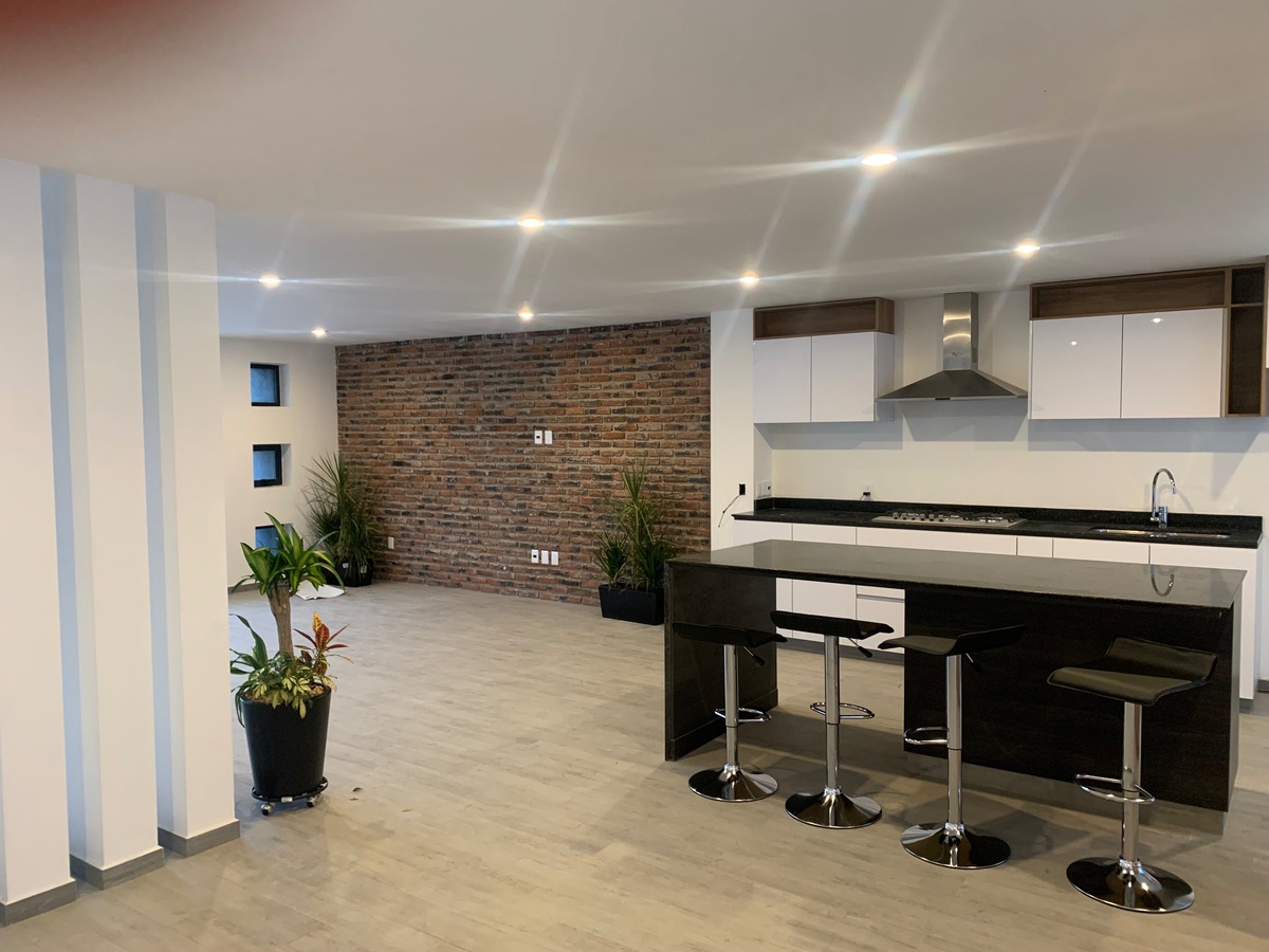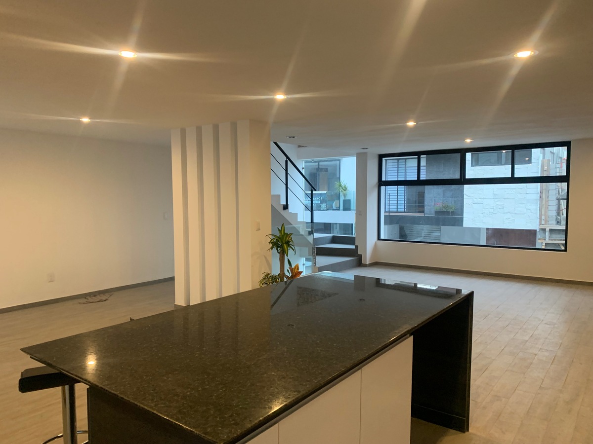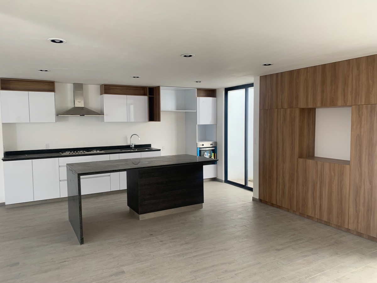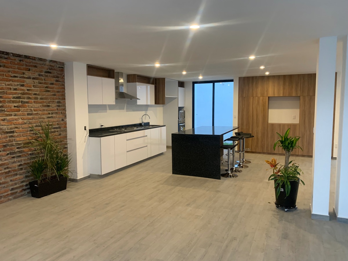 Estancia, sala, comedor y cocina con isla y barra de granito negro San Patricio con un ambiente familiar. Incluye horno de gas, horno de microondas, parrilla campana.