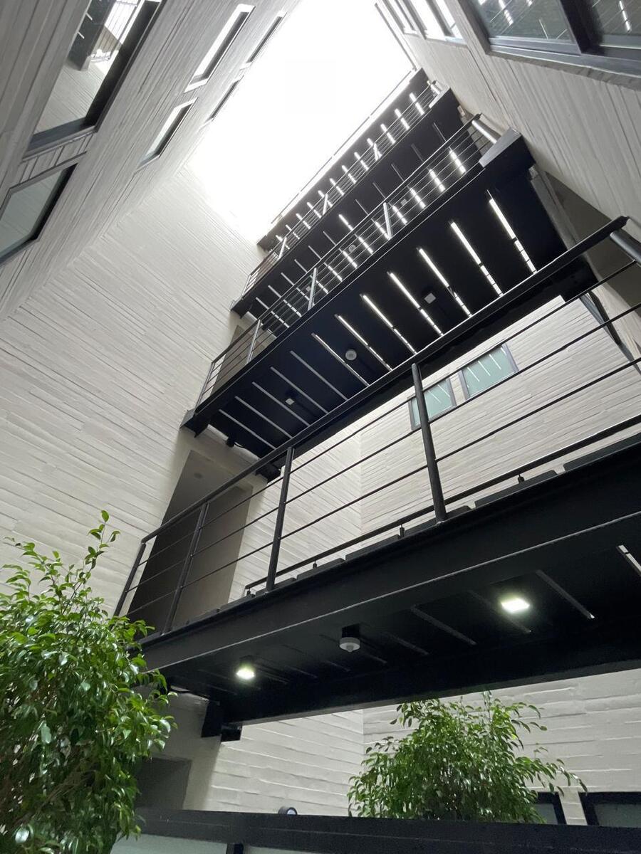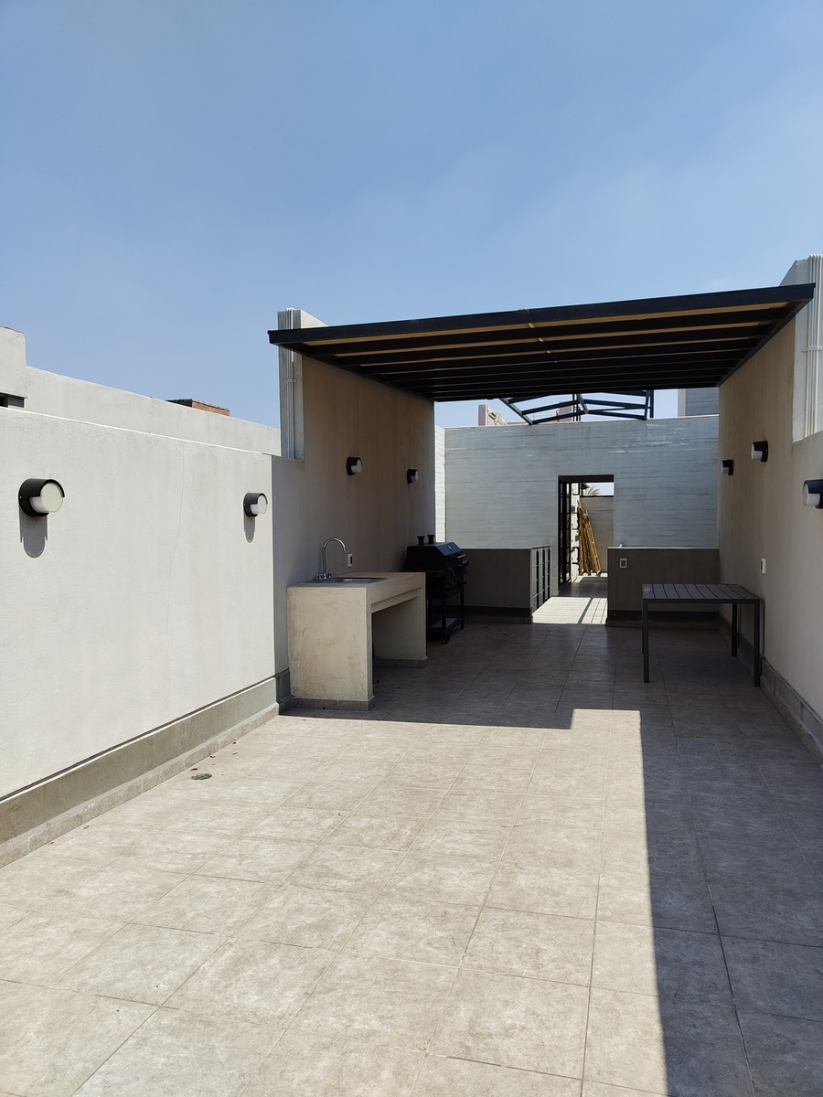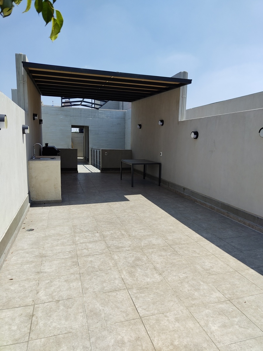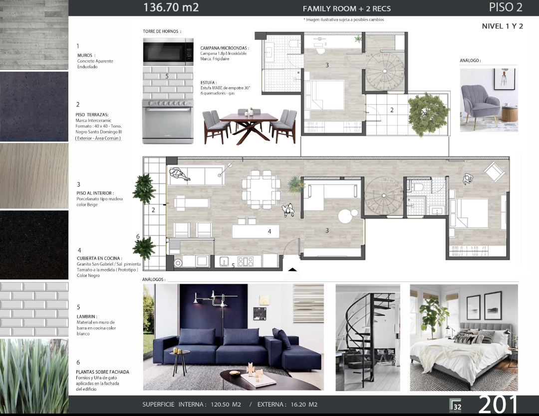 Este departamento tiene un área total de 136.70m², con 120.50m² de espacio interno y 16.20m² de espacio externo. Cuenta con 3 habitaciones, 2 baños, 1 lugar de estacionamiento con posibilidad de 2, un balcón y una patio.