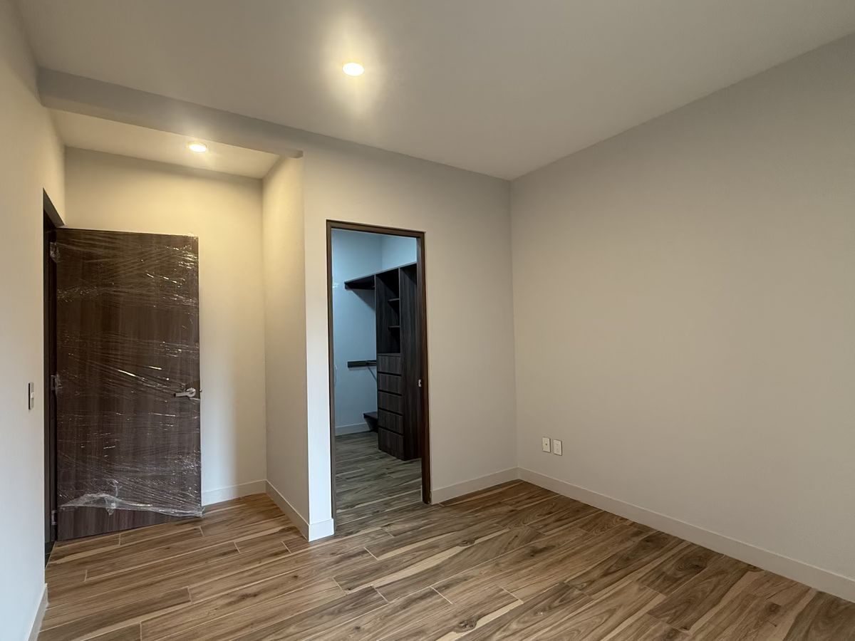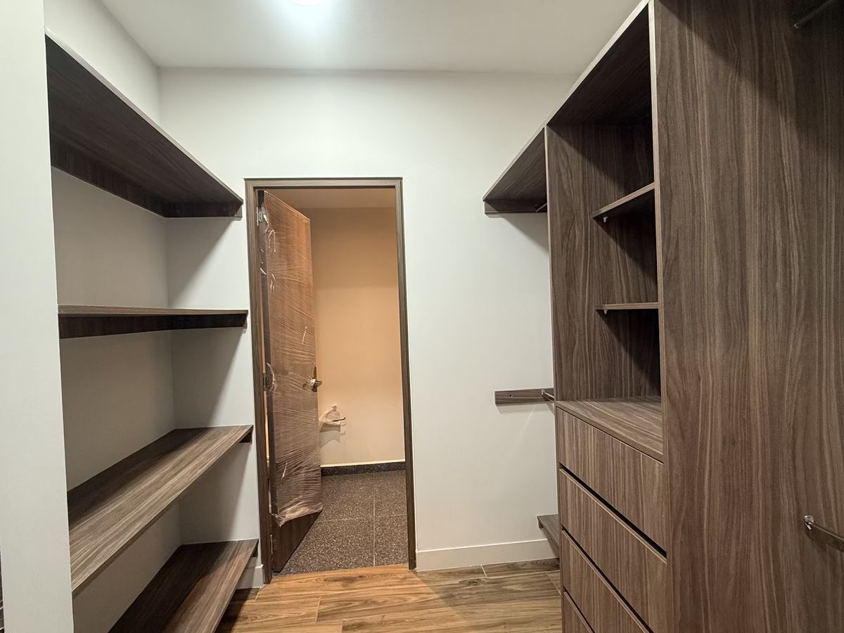 Cuenta con una **recámara principal con vestidor y baño privado**, creando un espacio íntimo y sofisticado.