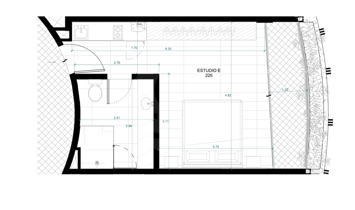 O estúdio é composto por cozinha, área de closet, amplo banheiro, dormitório e terraço de 10m2.
