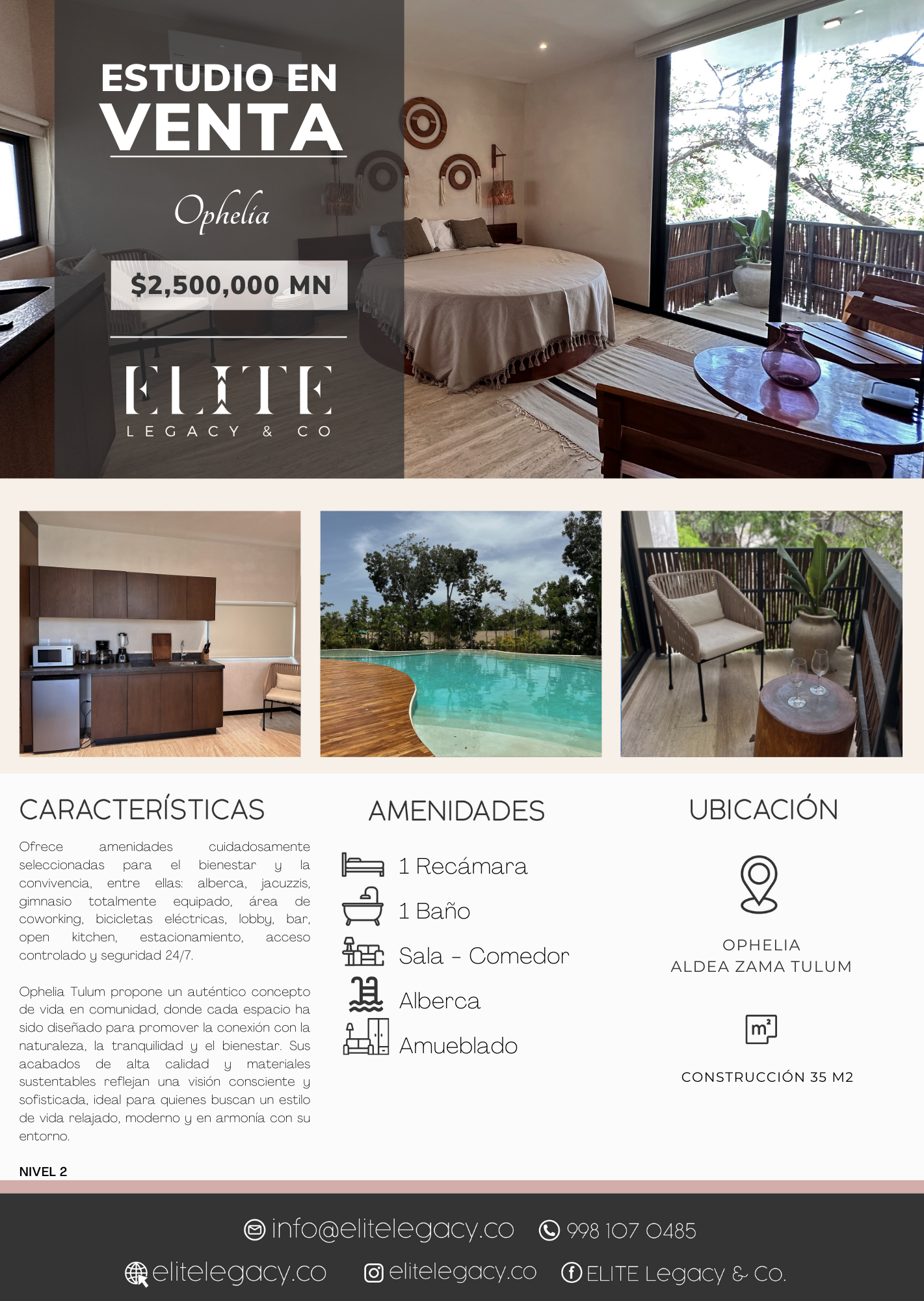 Ophelia Tulum es un exclusivo desarrollo residencial ubicado en Aldea Zama, conformado por 63 departamentos en el edificio norte y 102 estudios en el área sur, distribuidos en tres niveles que se integran de manera armónica con el entorno natural.