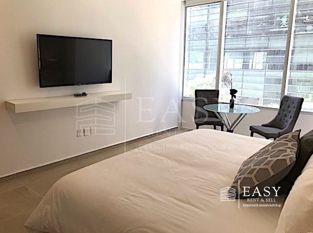 105 M2 de construcción, amueblado y equipado. Cuenta con 2 recamaras, 2 baños completos, 1 medio baño, sala
