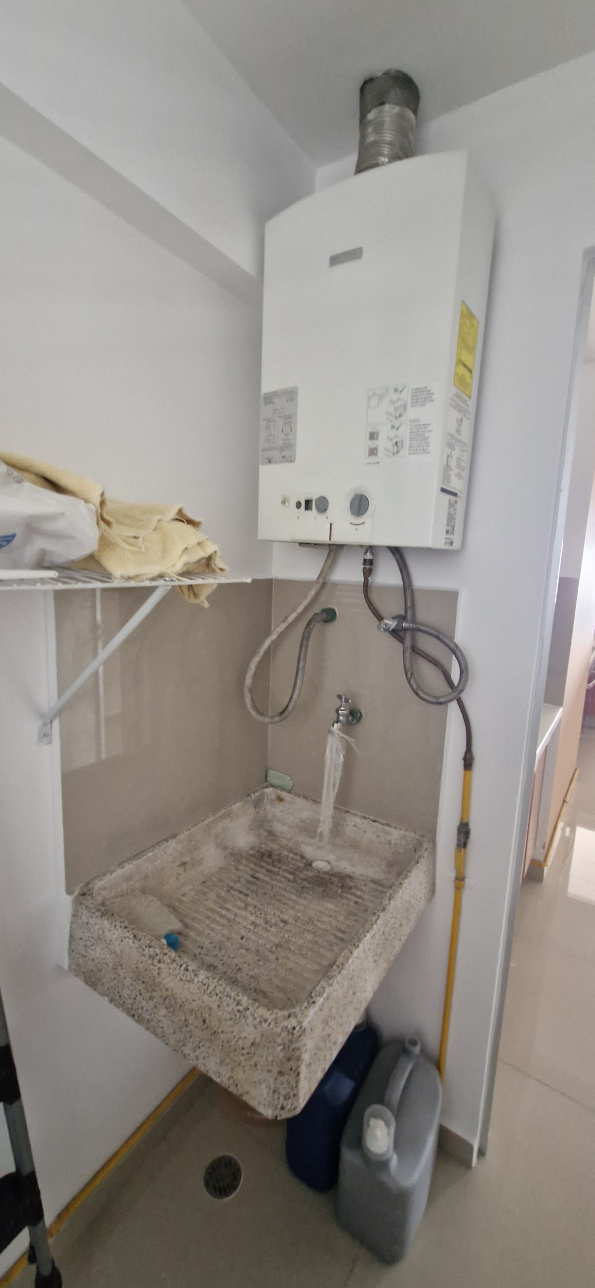 Uma cozinha integral semi-aberta, com área de lavanderia contígua,