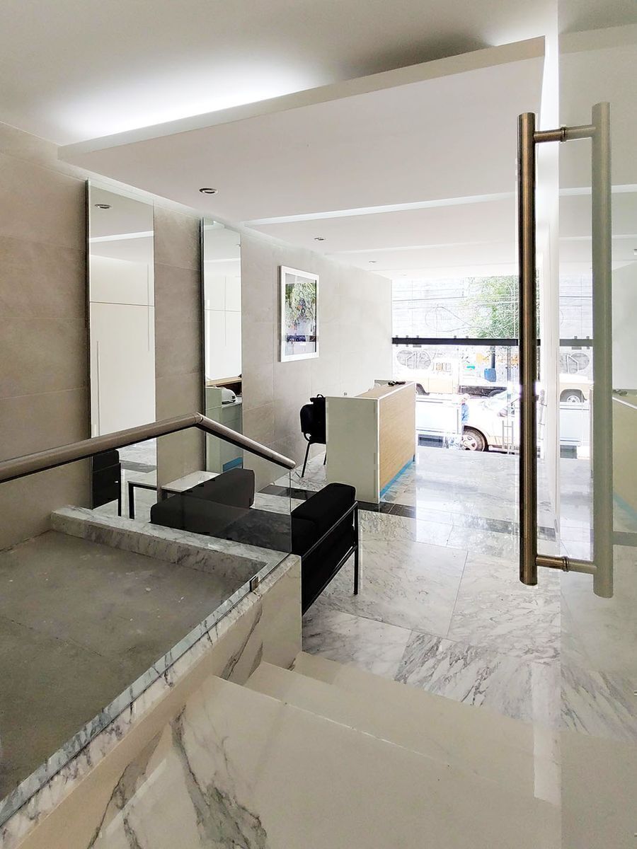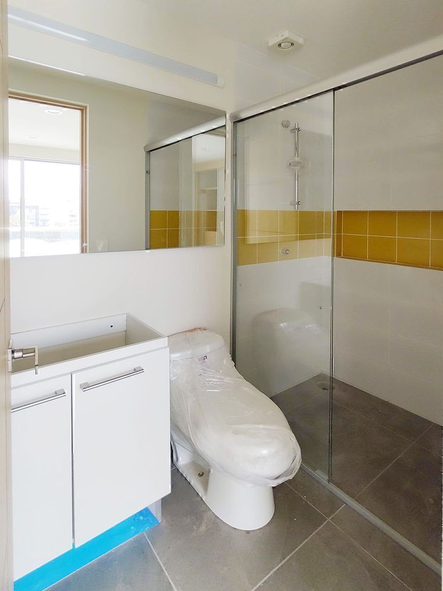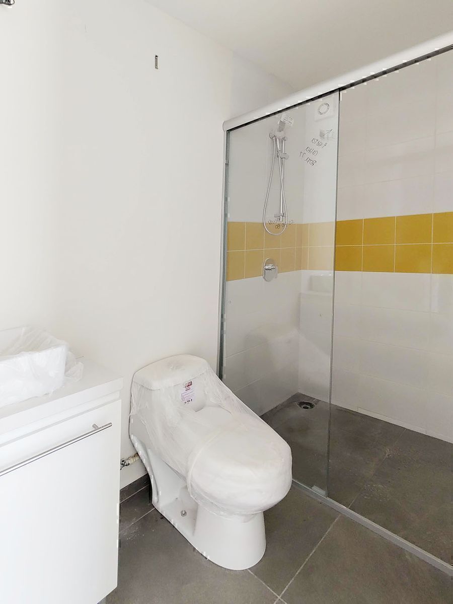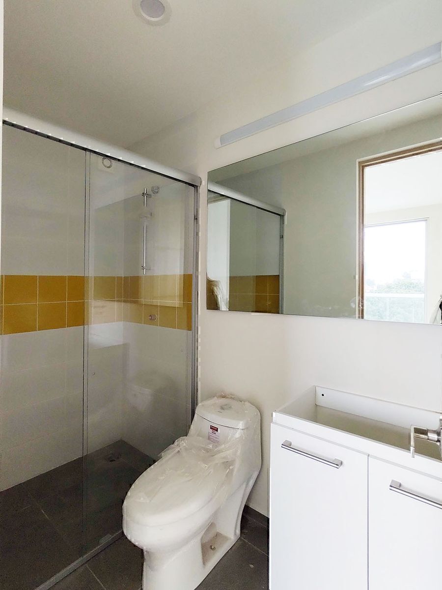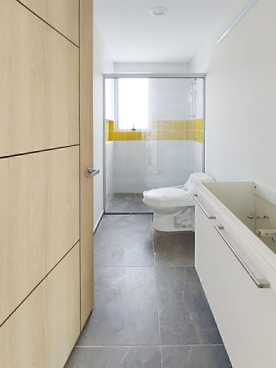 Dos baños completos con porcelanato antiderrapante, canceles, muebles de baño, espejo y accesorios.