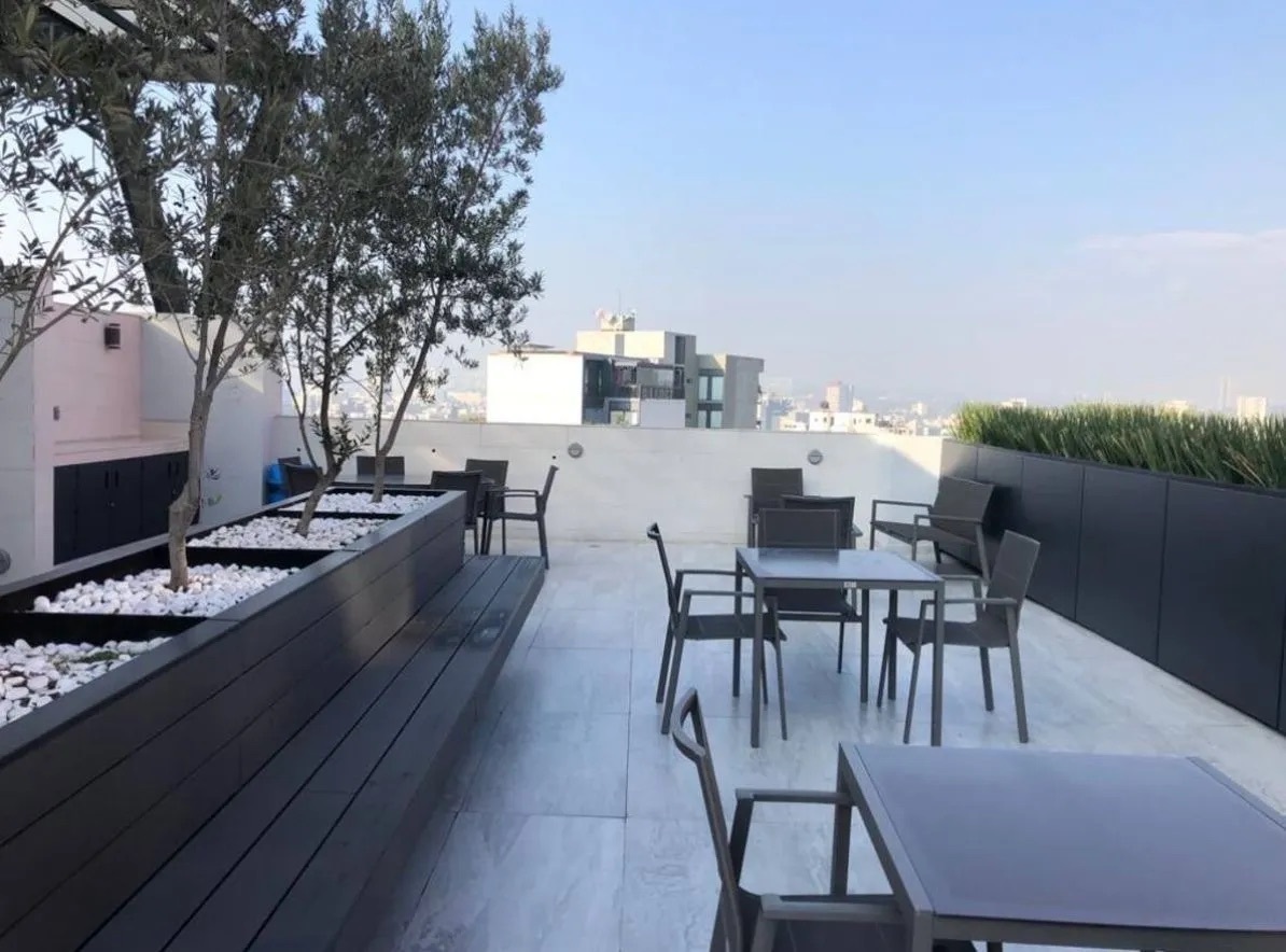 Amenidades destacadas: Terraza privada con vista a los árboles, alberca, gimnasio en la azotea con vistas panorámicas