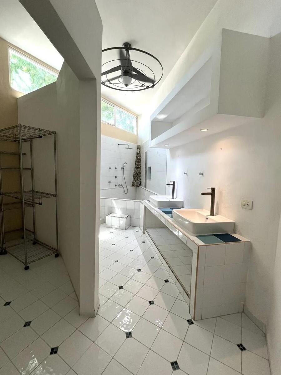 1 recámara principal con closet vestidor, baño completo con doble lavabo, tina.