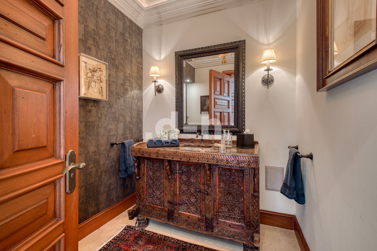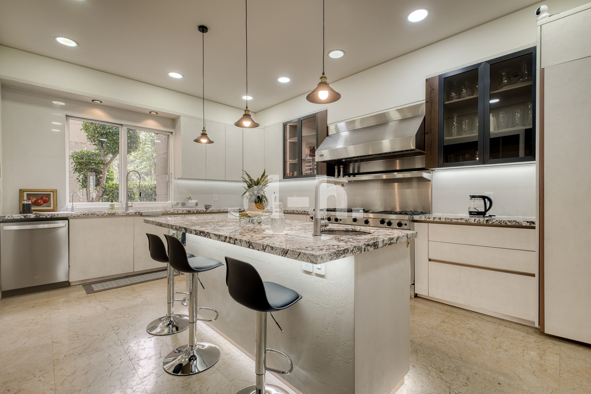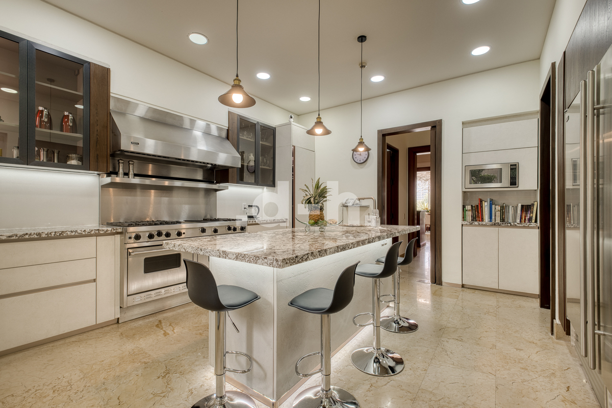 La cocina es completamente nueva, acompañada de una despensa generosa y un clóset exclusivo para vajillas. El comedor, pensado para doce comensales, se abre a dos salas con chimeneas, un espacio de billar y jardines que invitan a largas conversaciones. En la terraza posterior —con su mesa de mármol, bancas y una escultura de Nicki— el paisaje del campo de golf se convierte en parte del hogar.