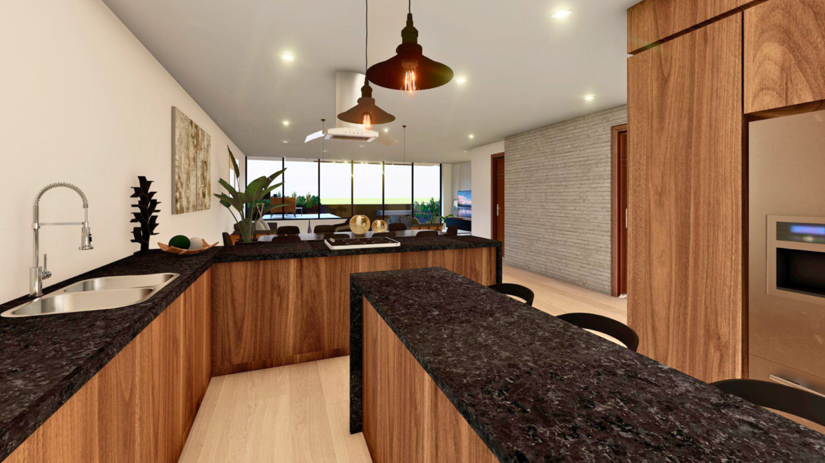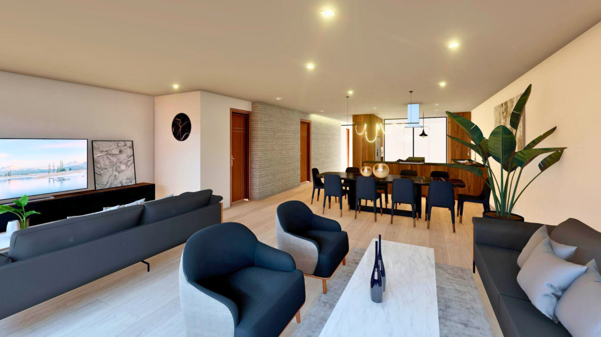- Puede entregarse con una distribución de 3 recámaras o 2 recámaras + sala de televisión