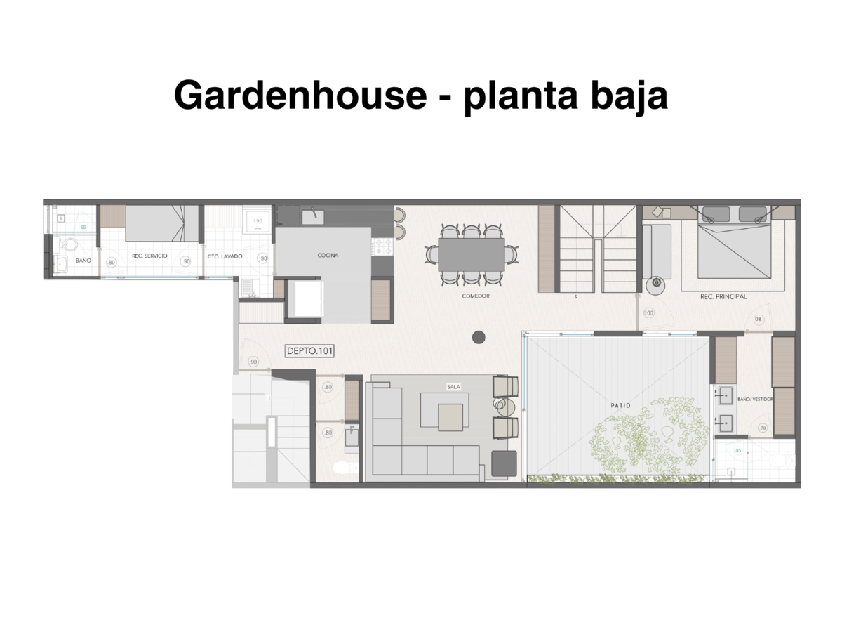 Distribuido en dos niveles, en la planta baja cuenta con una cocina semi-abierta con acceso al área de lavado y cuarto de servicio con baño completo. La sala-comedor se integra armoniosamente con una amplia terraza privada, permitiendo una excelente entrada de luz natural. En este nivel también se encuentra una recámara con walk-in closet y baño completo, con salida directa a la terraza.