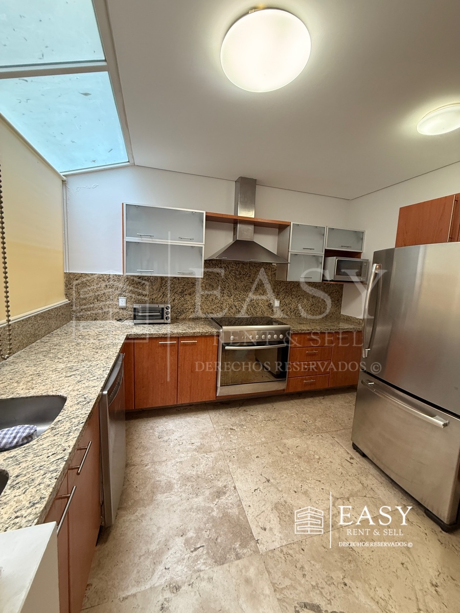 La cocina con luz natura y ventilación, además cuenta con salida a un patio interior, área de lavado y cuarto de servicio.
