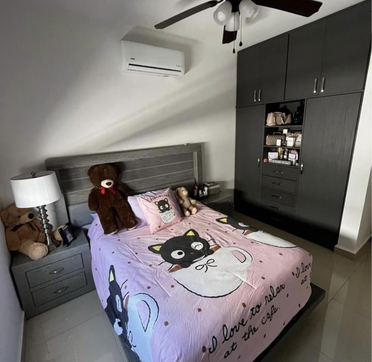 Área de estar com closet de roupas de cama