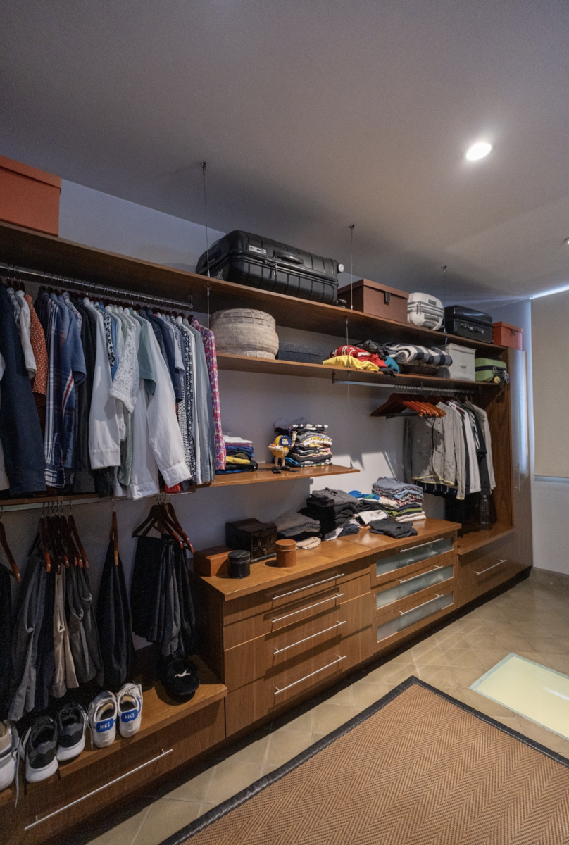 - O quarto principal no andar de cima, espaçoso, com closet e banheiro privativo que inclui banheira e chuveiro.