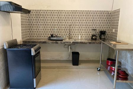 COZINHA MINIMALISTA COM BANCADA DE GRANITO PRETO E UM FOGÃO ELÉTRICO MONTADO, PIA EM AÇO INOXIDÁVEL COM TORNEIRA MONOMANDO DE PRESSÃO, GAVETAS EM MADEIRA DE CEDRO.