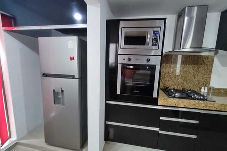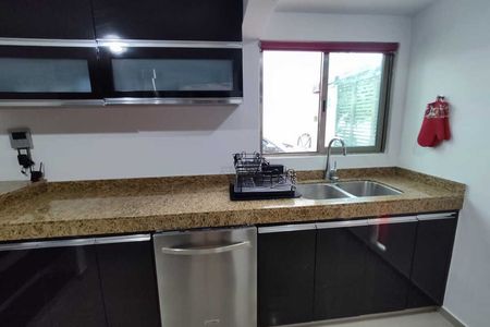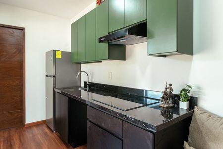 COCINA MINIMALISTA CON BARRA DE GRANITO NEGRO Y UNA PARRILLA ELECTRICA MONTADA EN ELLA, TARJA EN ACERO INOXIDABLE CON LLAVE MONOMANDO DE PRESION , GAVETAS EN MADERA DE CEDRO.