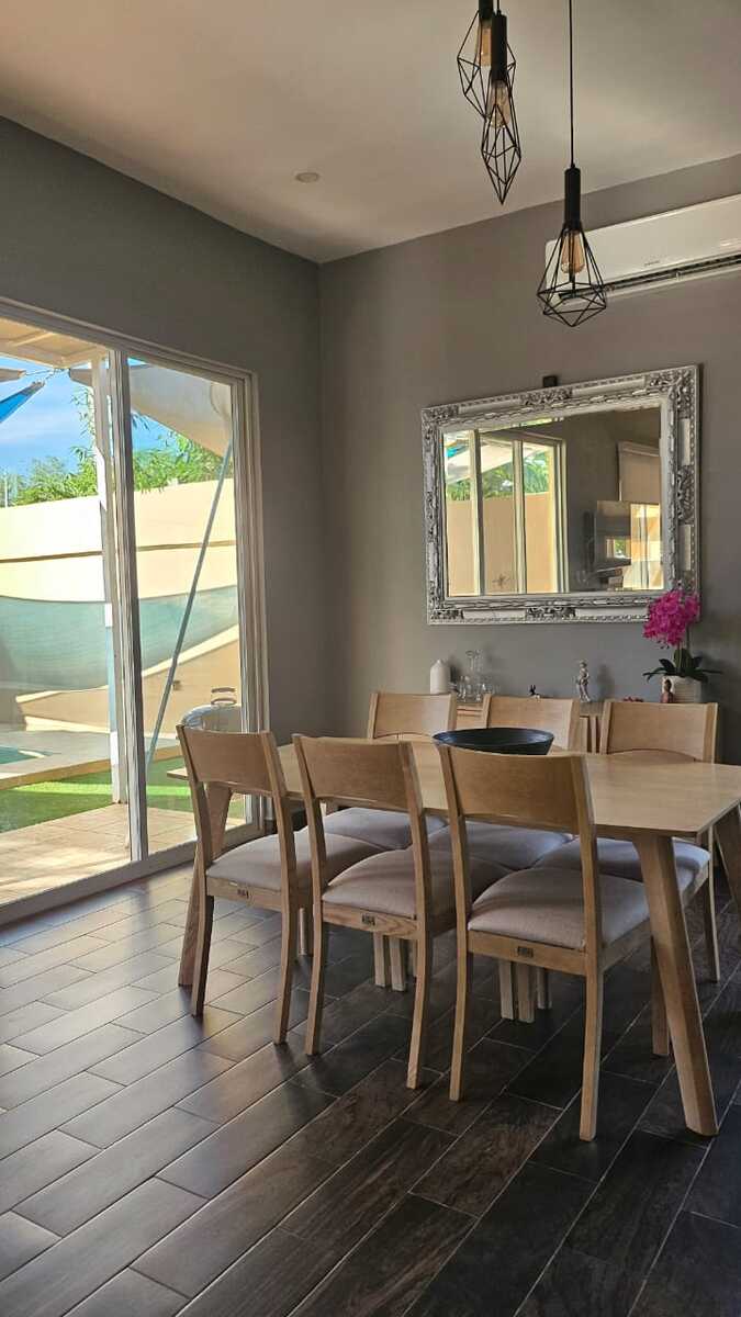Sala /comedor corrido con aire acondicionado con hermosos ventanales con vista al area de piscina y puerta de acceso a este.
