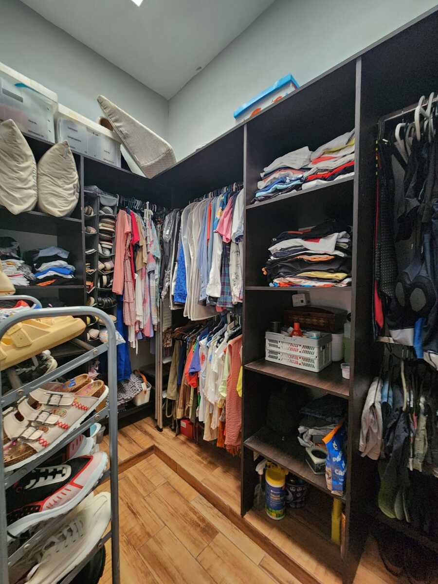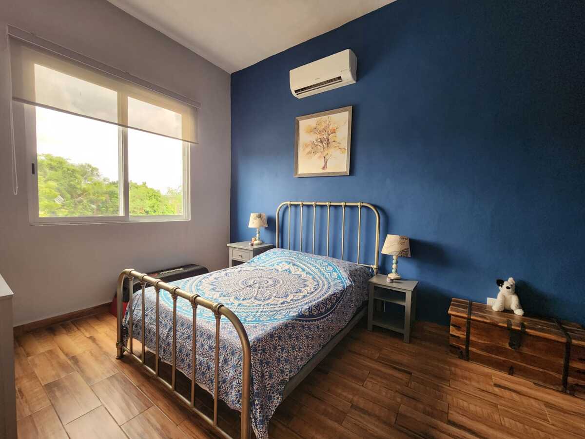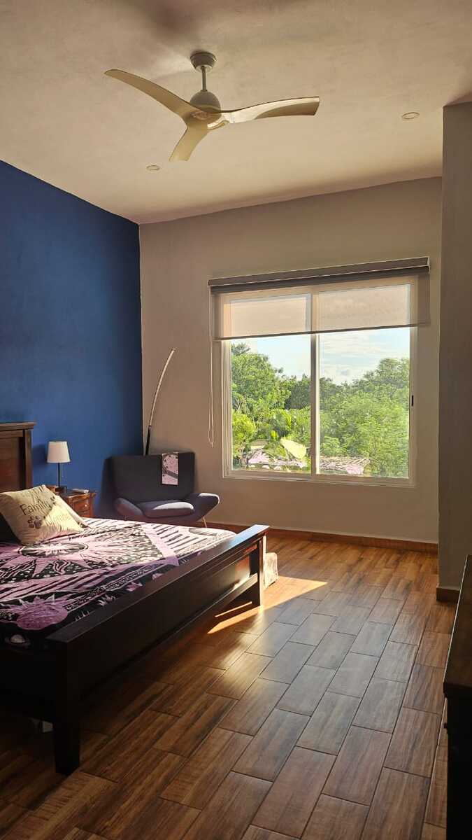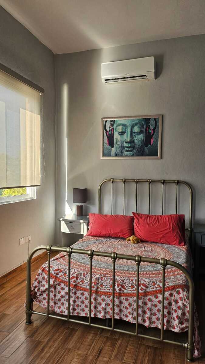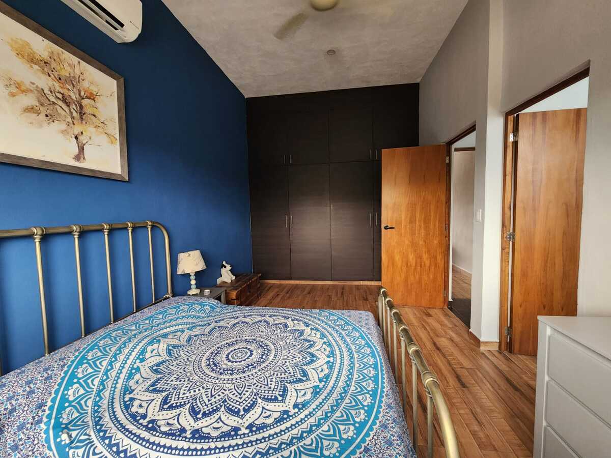 Recamara 1 secundaria con closet completamente vestido , aire acondicionado y ventilador y baño completo.