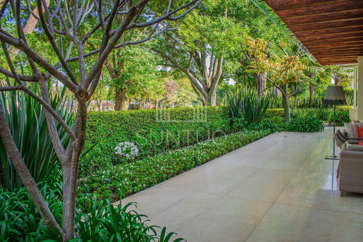 Do lado de fora da sala de estar, o terraço principal, que tem uma área de bar com um grande bar de granito, uma espaçosa área social e de jantar com grandes árvores e uma bela vista. Todo o exterior da casa é conectado por caminhos de pedra, além de ser cercado por excelente paisagismo e iluminação.
