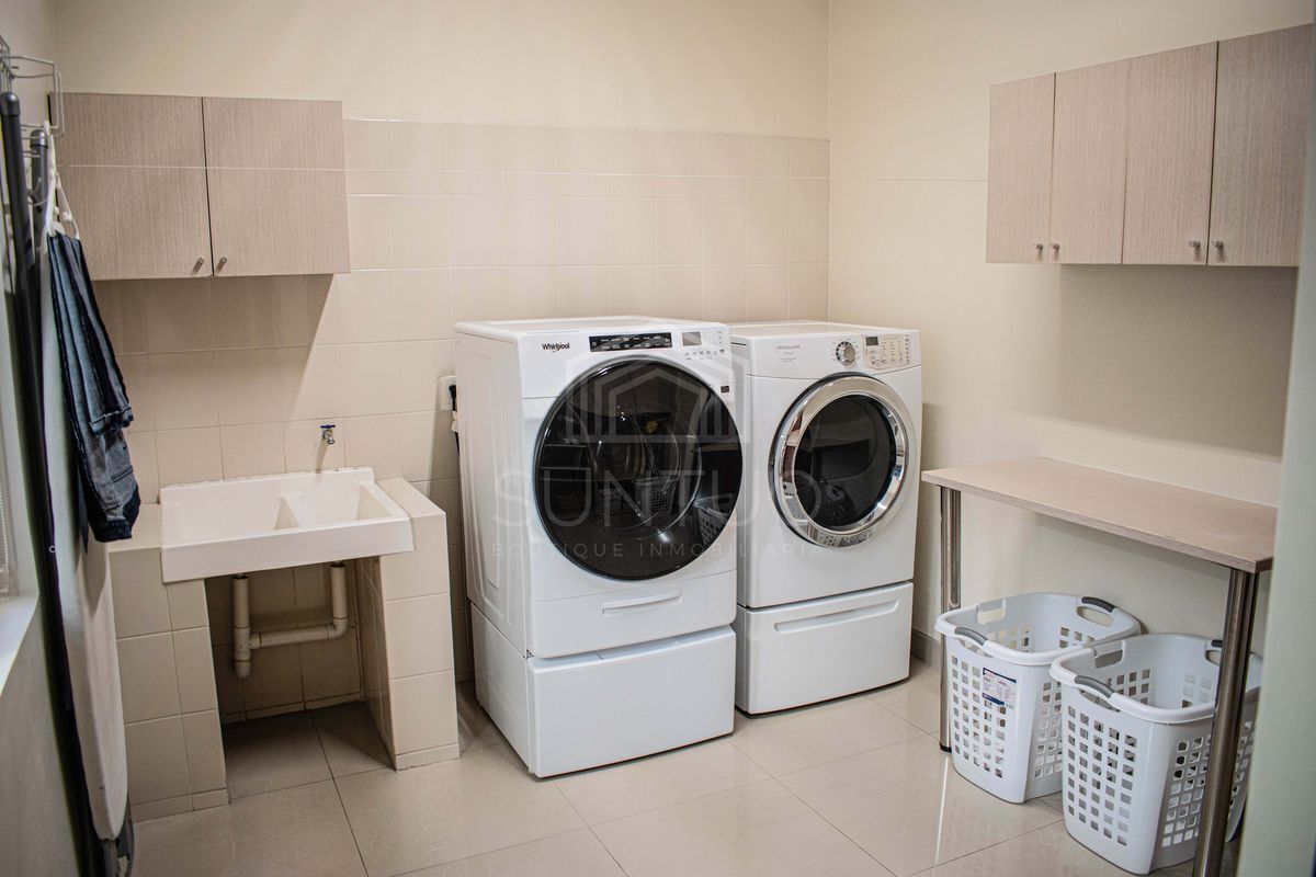 De vuelta al interior de la casa, iniciamos por la cocina que además de ser amplia e iluminada está equipada con las mejores marcas de electrodomésticos, tiene anexo una bonita área de antecomedor, rodeada de un gran ventanal y vista al campo de golf. Junto al área de cocina se encuentra la lavandería, las alacenas, el cuarto de servicio de muy buen tamaño con baño completo.