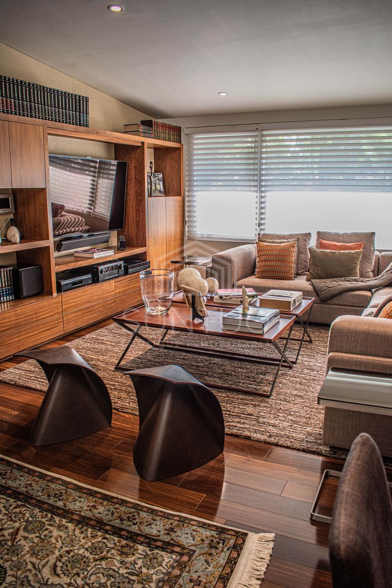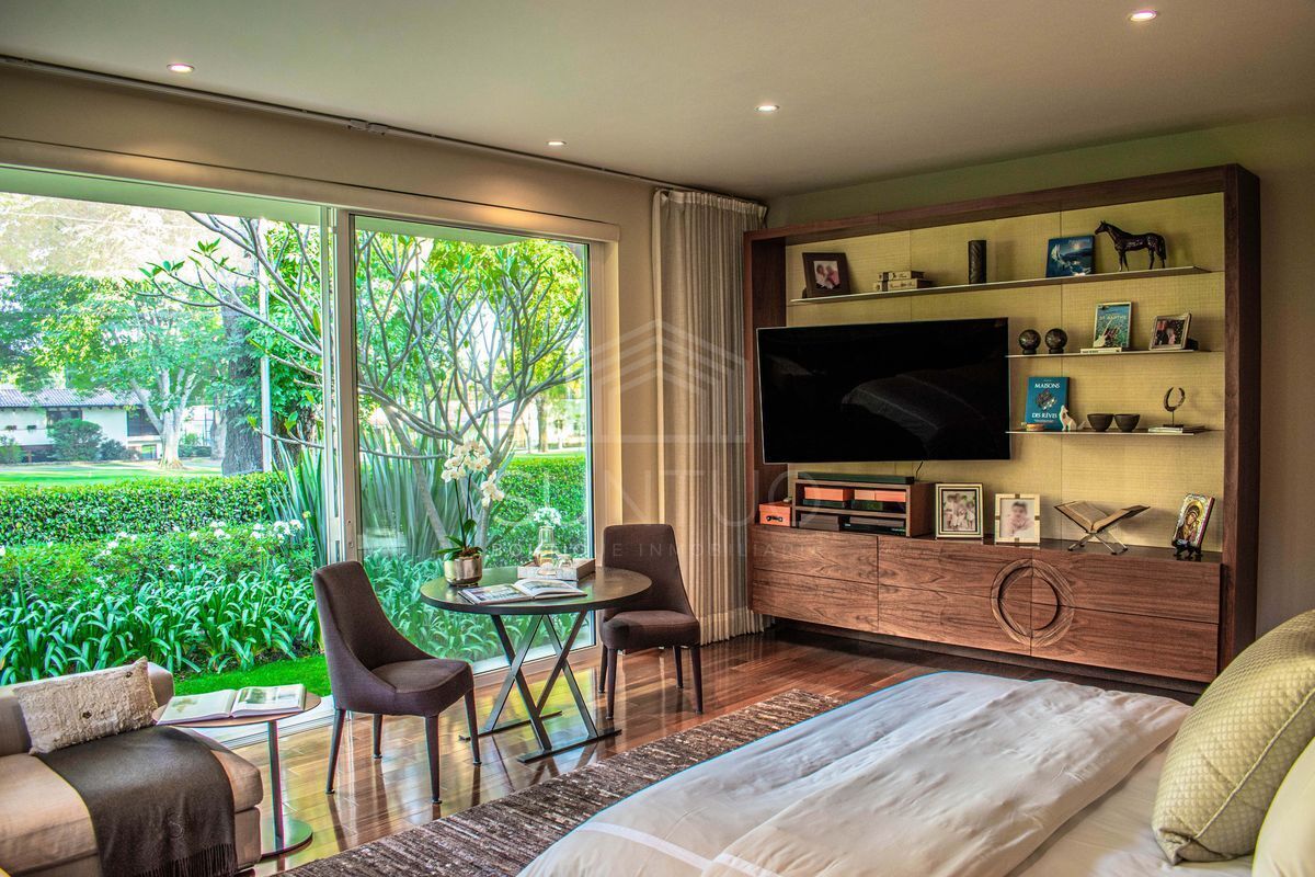 Al ingresar nos recibe un foyer que destaca las maderas de las paredes y los pisos de mármol de gran formato, abriéndose paso al salón de la casa donde se ubican el comedor formal y la sala principal, iluminados, con elegantes desniveles y el jardín de fondo.
