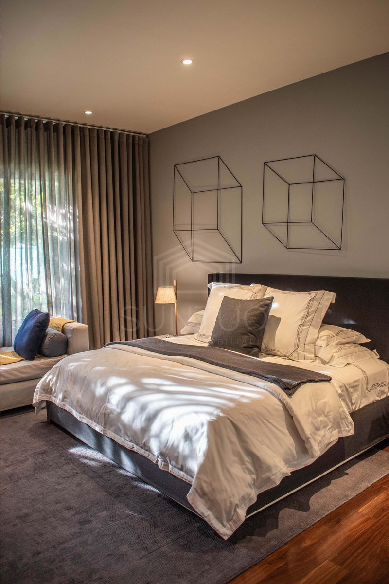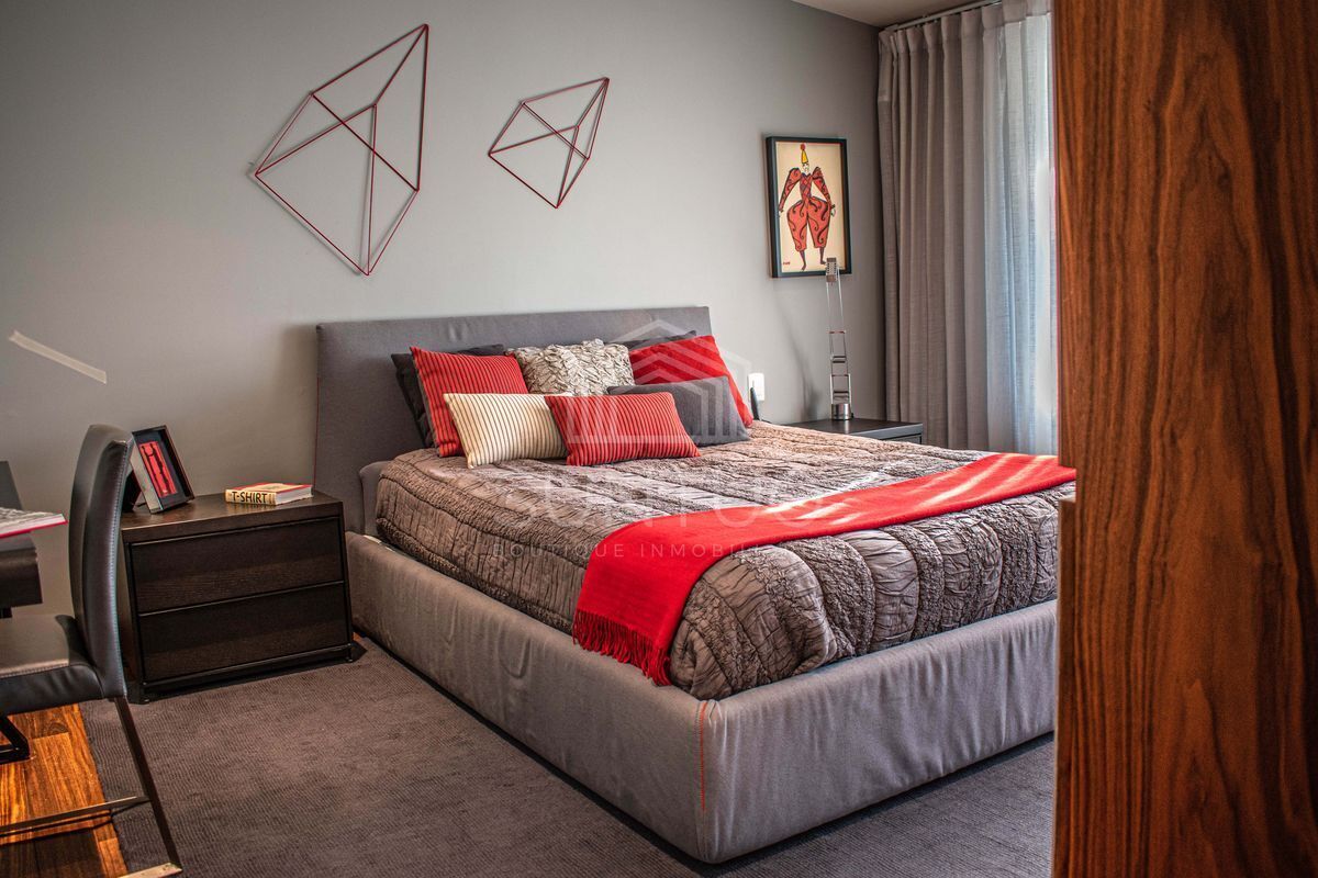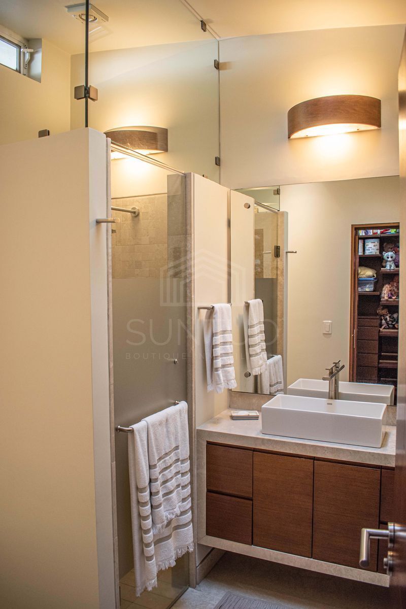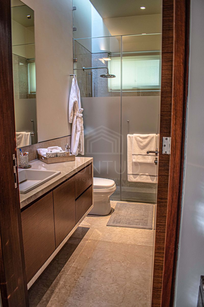 Frente a ellas la recamara principal, dentro un pequeño distribuidor separa el baño y el vestidor del dormitorio. El baño iluminado por luz natural tiene doble lavamanos, área de wc, y regadera independiente y se conecta con un amplio vestidor, también iluminado y con espacios para dos personas. El dormitorio es acogedor, con vistas a los jardines y bonitos terminados que invitan al descanso.