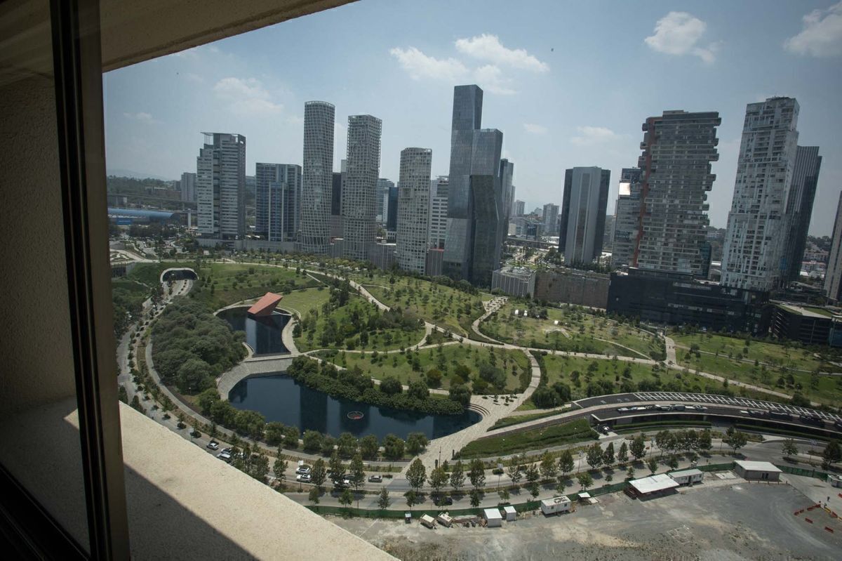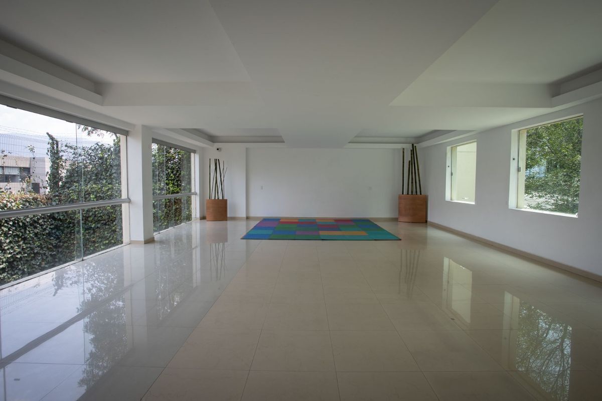 La sala de estar y el comedor son espaciosos y luminosos, con acceso a una terraza que ofrece impresionantes vistas panorámicas del bosque y del parque de La Mexicana, brindando un ambiente tranquilo y relajante. También hay una sala de televisión separada, ideal para momentos de entretenimiento y relajación.