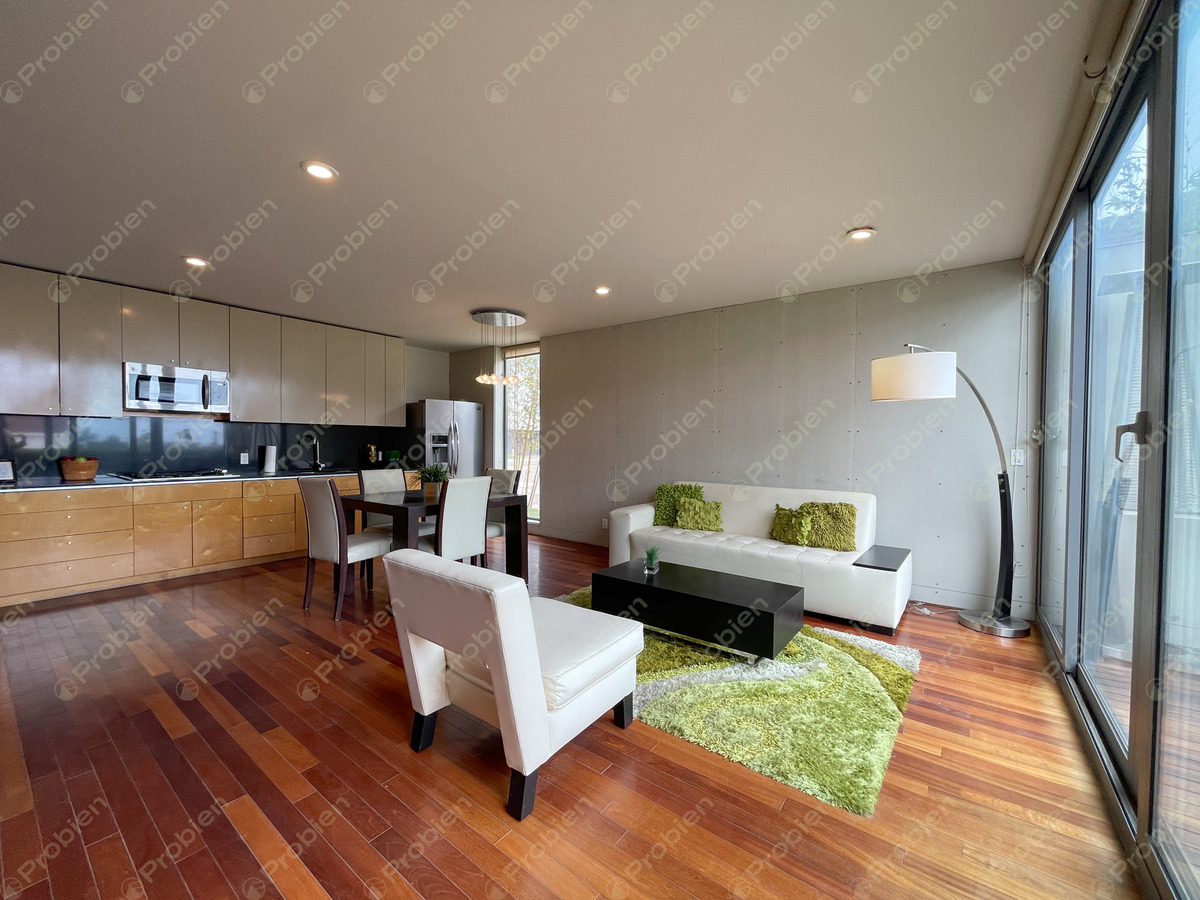 Primera planta: Sala, comedor y cocina con cubierta de granito en concepto abierto, terraza con acceso al jardín de la privada, cochera techada para dos autos y medio baño.