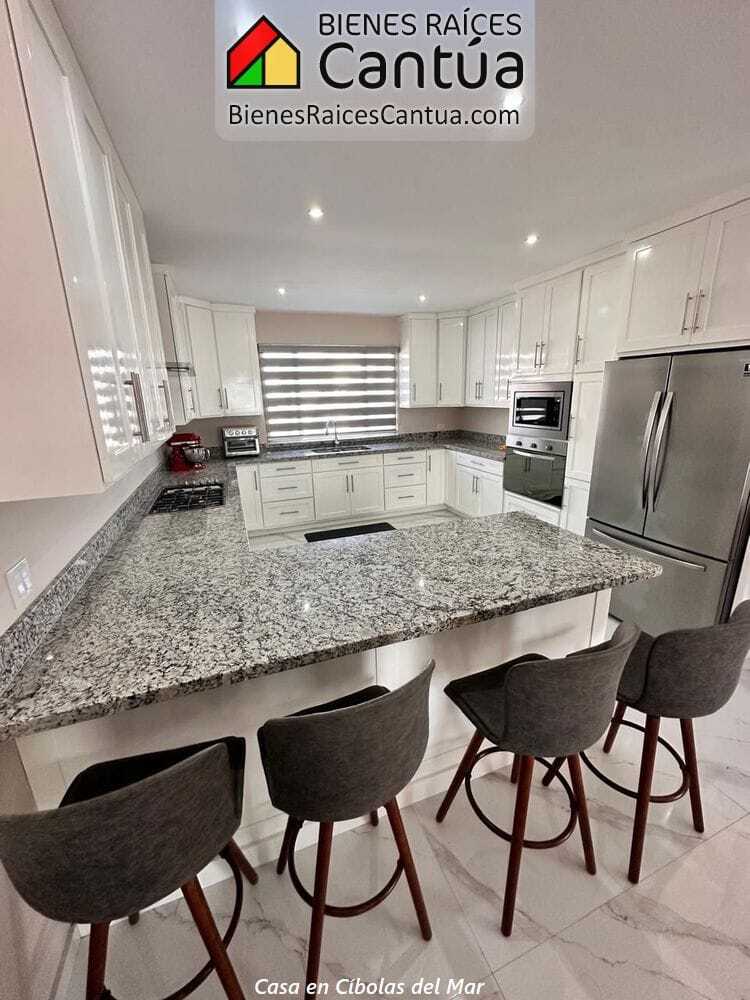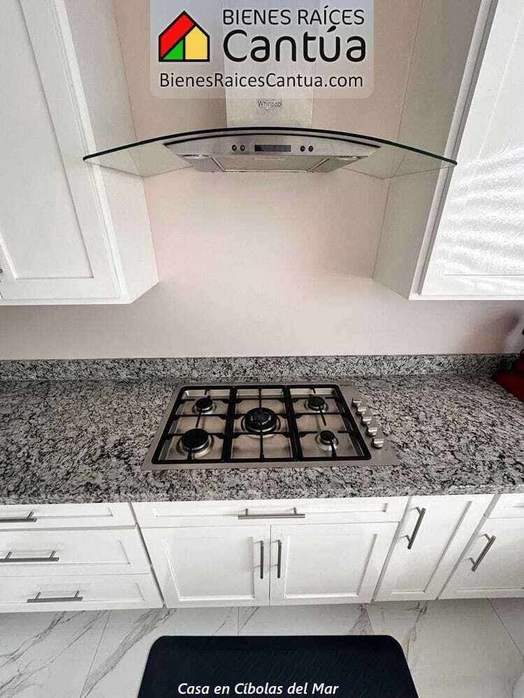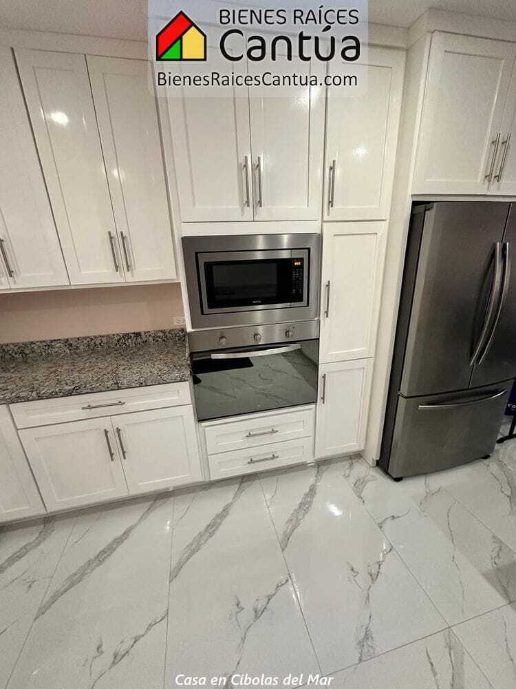 • Cocina integral equipada con estufa, microondas, refrigerador, horno, hornito y campana.