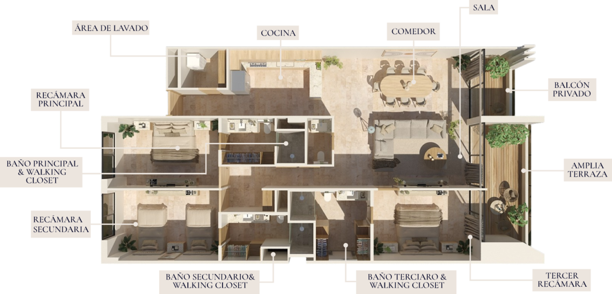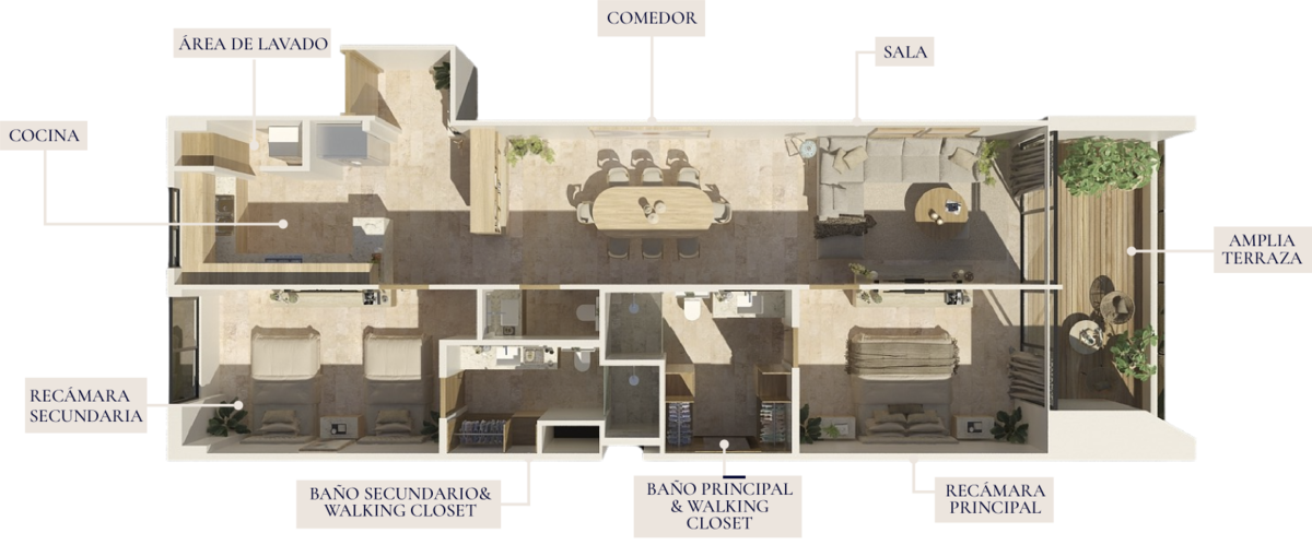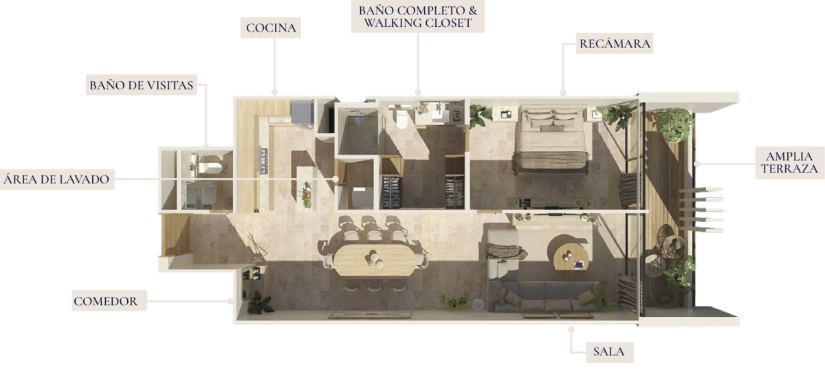 Ofrece una experiencia de lujo con 102 metros cuadrados de espacio. Este exclusivo diseño incluye una espaciosa recámara con baño completo y walking closet, una elegante cocina, un comedor y una sala.