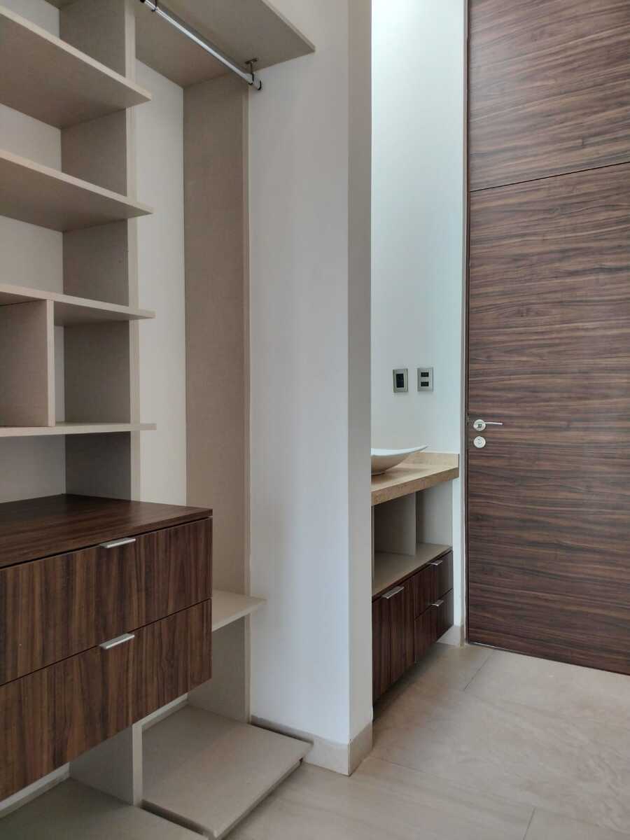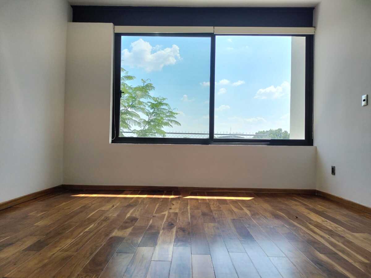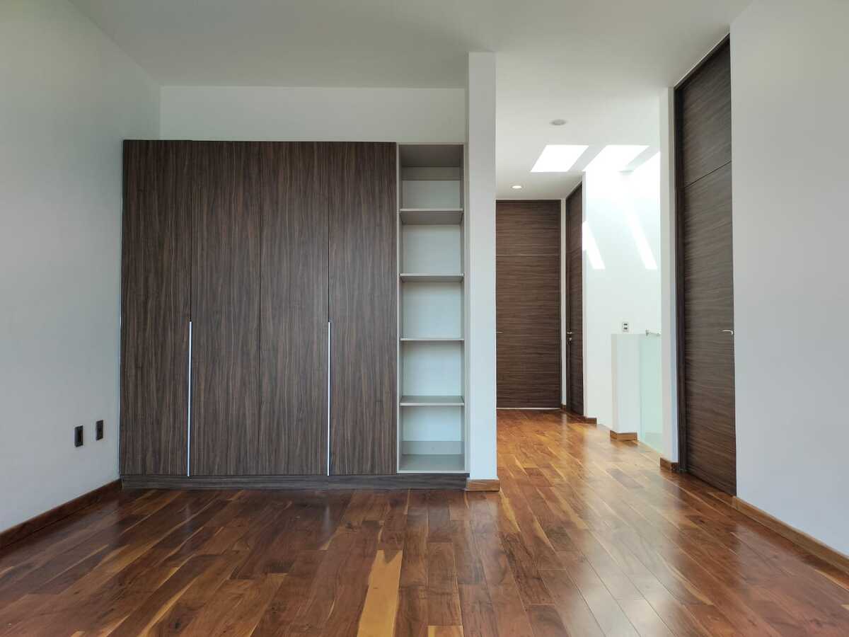 La casa cuenta con tres habitaciones con vestidor y baño independiente, un estudio en planta baja, sala de TV en planta alta, cuarto de servicio, sala, comedor, medio baño en planta baja, cochera para tres autos y cocina equipada, acabados de primera, tragaluz con pérgolas en escalera y perfectamente bien iluminada.