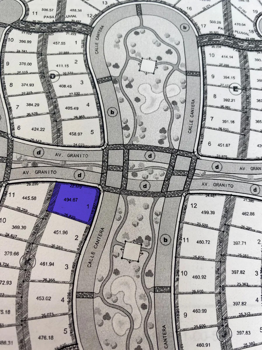 Terreno à venda no exclusivo complexo residencial privado “La Cantera” em um corredor rural. O terreno está localizado em frente a uma área verde, com uma área de 494,67 m2.