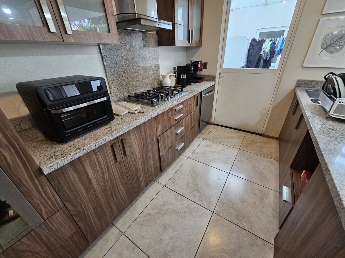 La casa moderna e iluminada de dos pisos, en la planta baja : Cocina integral con placa de granito, lavavajillas, horno de microondas y refrigerador de vinos, parrilla y campana.