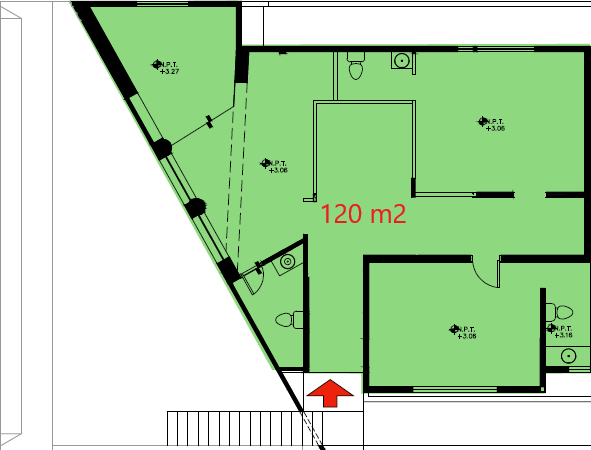 Superficie de 120 m² en segunda planta, con área libre, recepción, oficina principal con baño, dos oficinas privadas y dos baños adicionales.