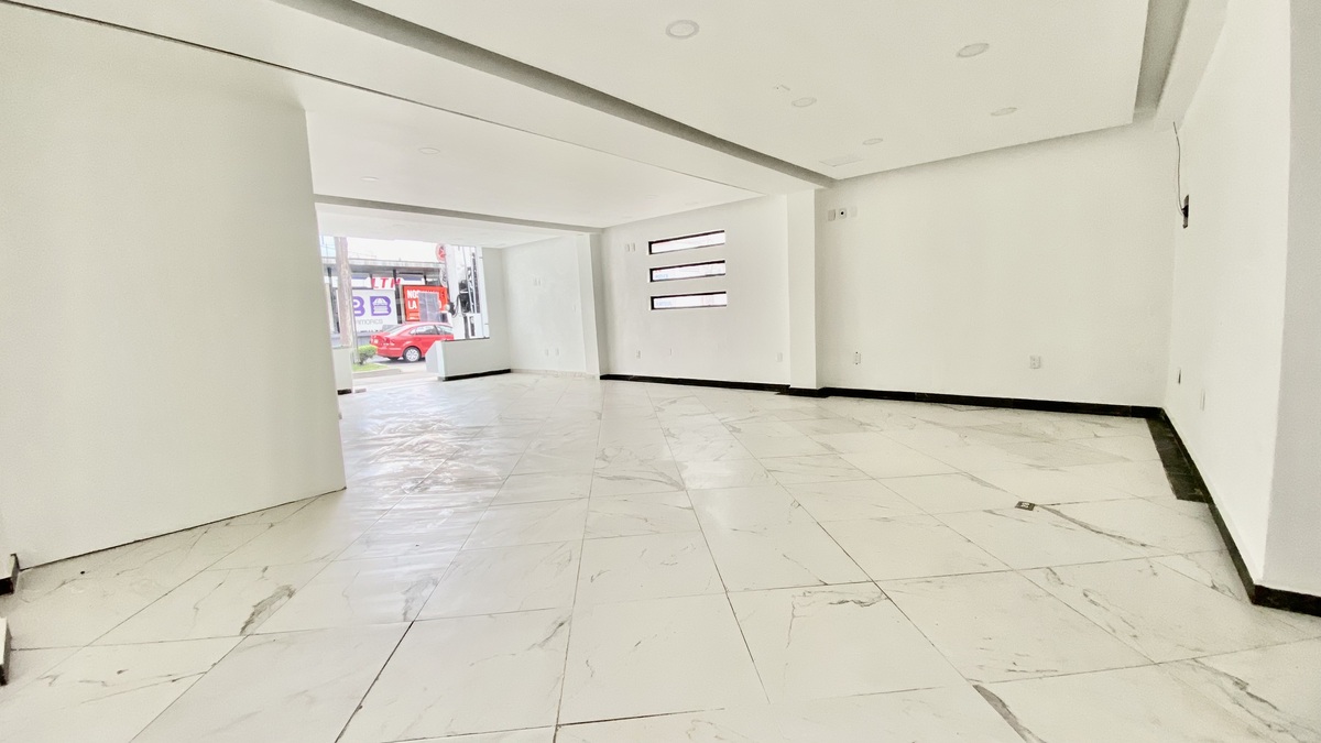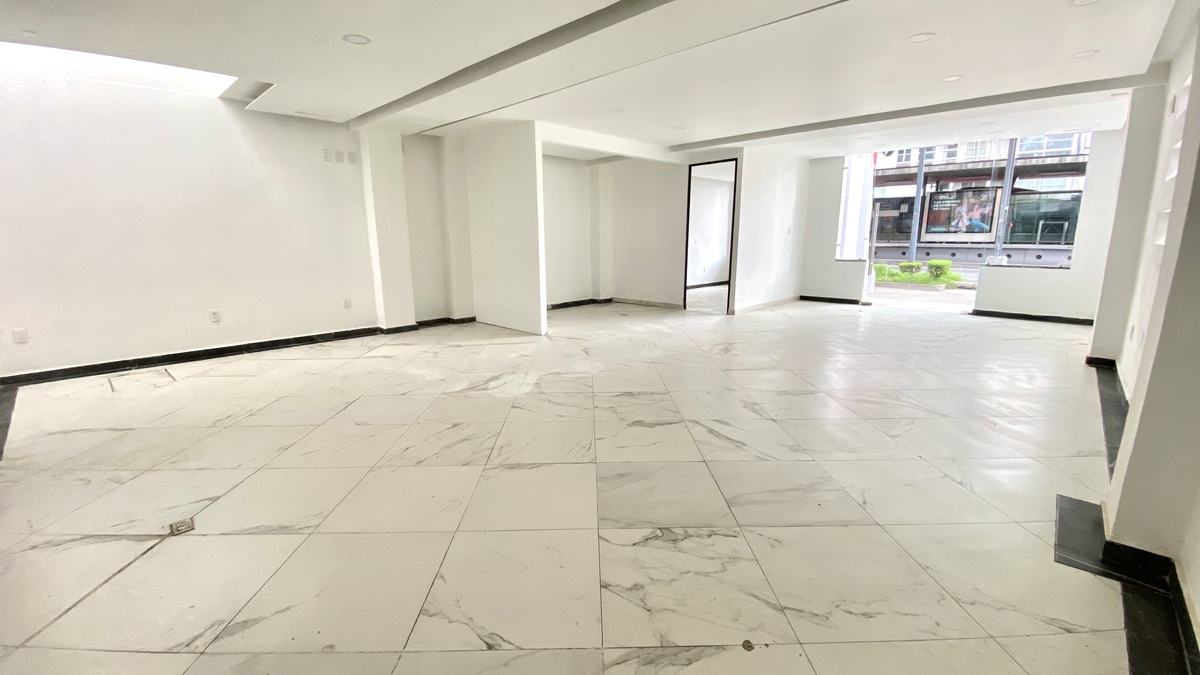 Localizado no andar térreo (apenas um nível), vista externa ao nível da rua.