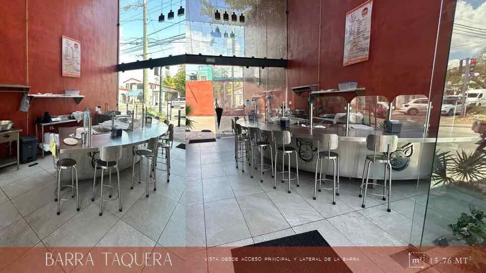 Áreas de Atención: Barra Taquera especializada y Barra de Bebidas, diseñadas para un servicio eficiente.