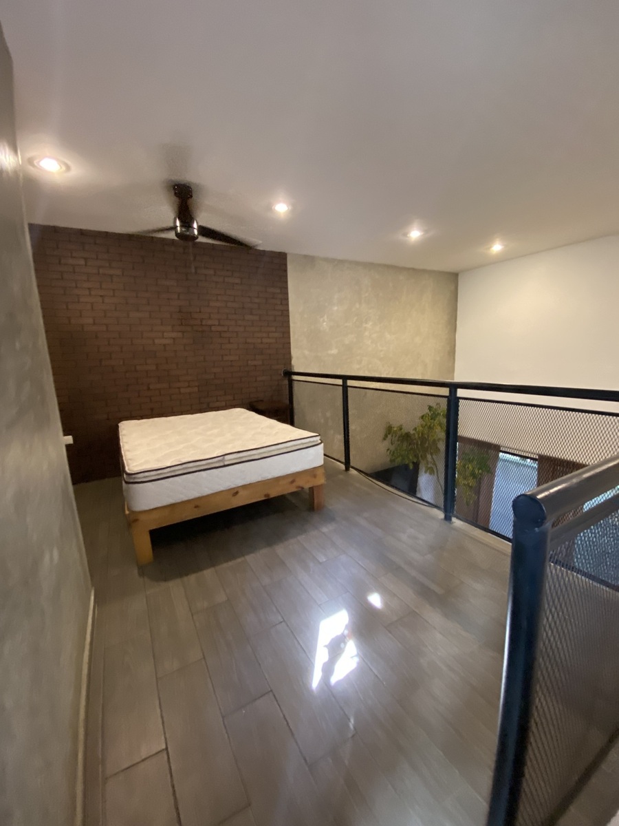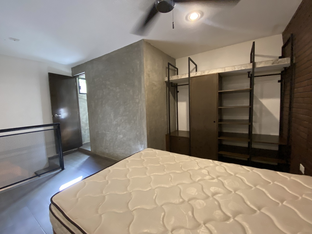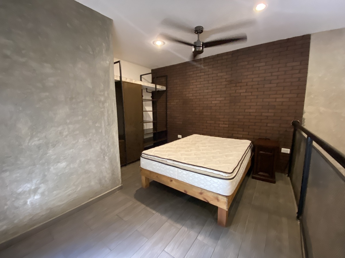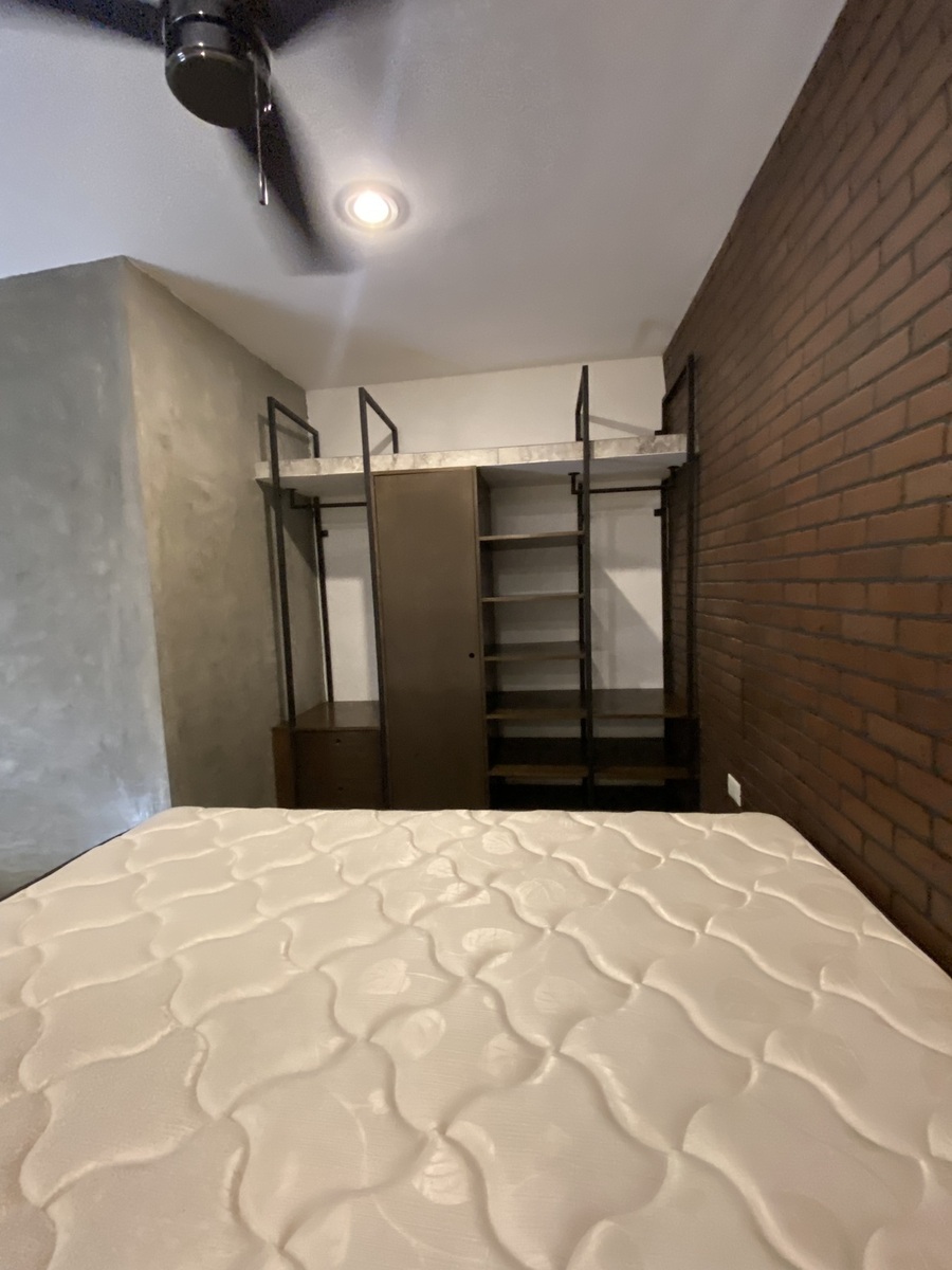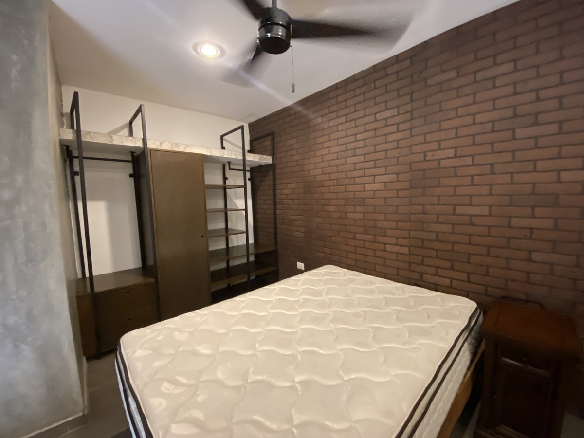 1 dormitorio con vibras industriales, en el 2do nivel, con su ventilador de techo, un closet minimalista para mentes organizadas, con sus cajoneras de madera.