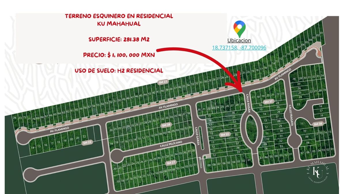Lote Esquinero en Residencial Ku Mahahual. Ubicación privilegiada con vista al parque y a la ciclovía.