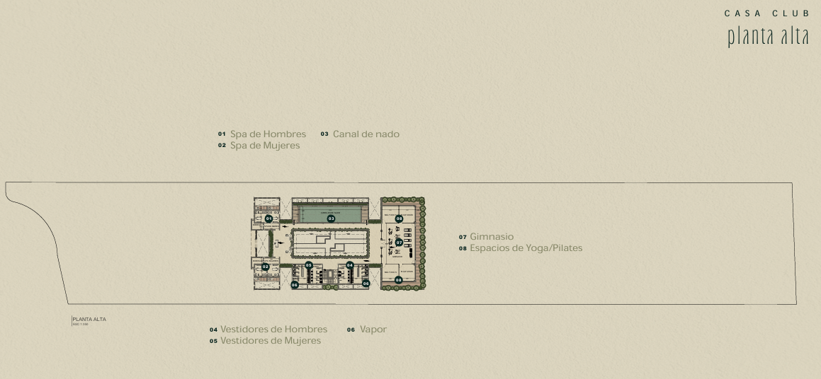 • Actividad física: gimnasio, canal de nado, alberca con terraza, canchas multiusos y de pádel, áreas deportivas.