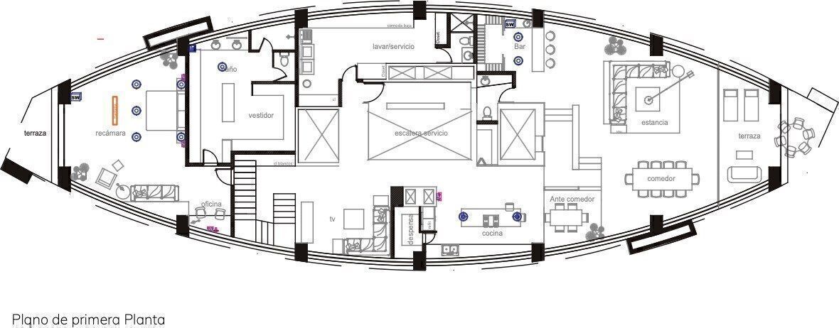 -Sala, comedor, bar, cocina, estudio, recamara principal y baño completo.