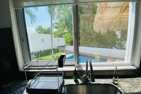 A casa oferece amplos e confortáveis espaços abertos, integrados harmoniosamente com o ambiente natural. Conta com uma garagem para três carros, uma sala de estar e jantar espaçosa e uma cozinha ampla equipada com uma despensa generosa. Os detalhes arquitetônicos são complementados por belas palapas e um encantador pátio de vasos, que trazem frescor e um ambiente relaxado.