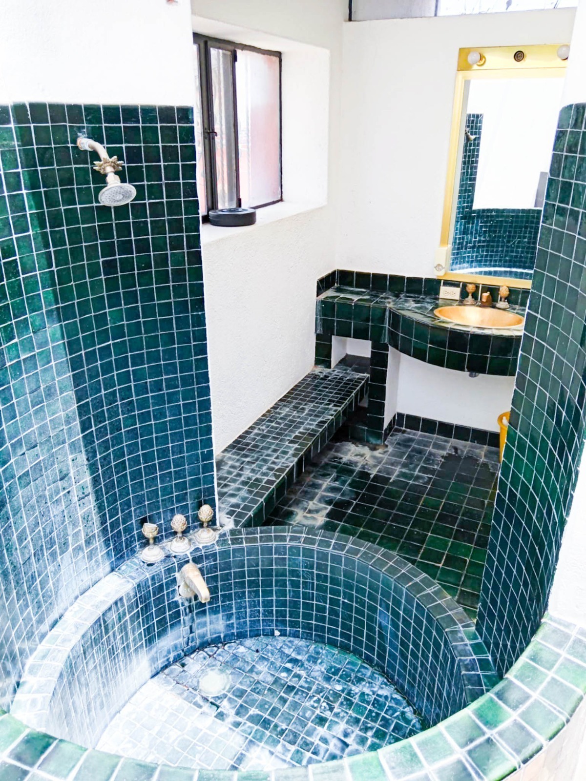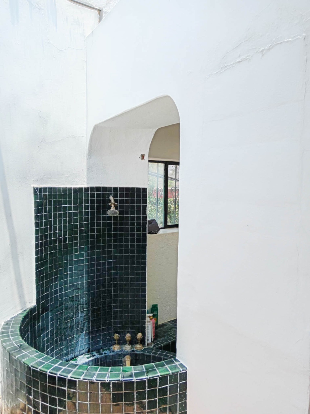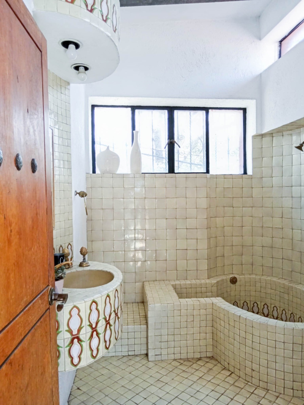 Nela temos uma sala e uma sala de jantar, ambas com lareira e uma cozinha mexicana; dois quartos, o Master com banheiro completo, banheira e closet. Além disso, há outro banheiro completo, também com banheira. Depois, o jardim, com área de grama e árvores, distribuído em dois terraços.
